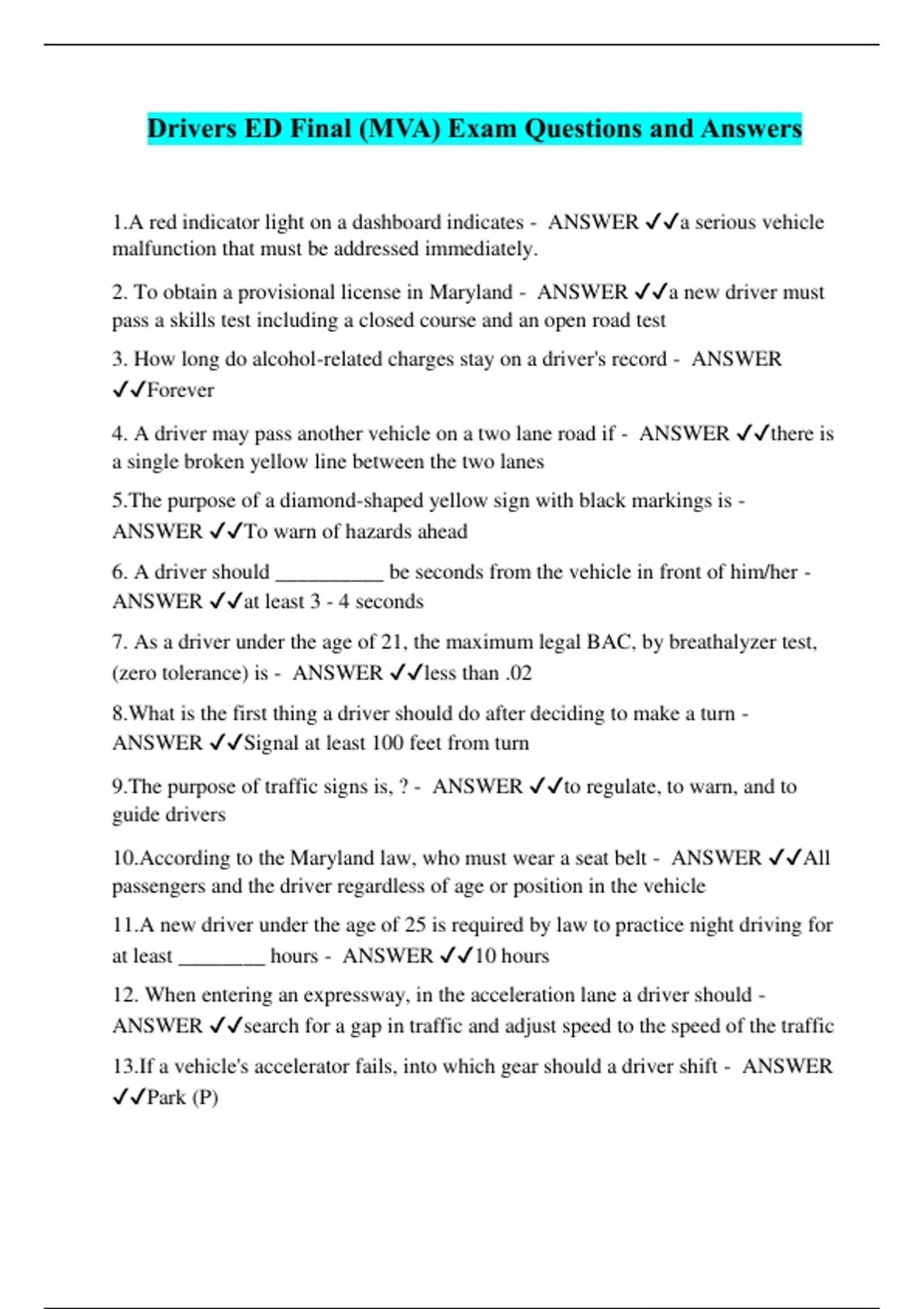 Drivers ED Final (MVA) Exam Questions and Answers 1.A red indicator light on a dashboard indicates - ANSWER ️️ a serious vehicle malfunction that must be addressed immediately. 2. To obtain a provisional license in Maryland - ANSWER ️️ a new driver must pass a skills test including a closed course and an open road test 3. How long do alcohol-related charges stay on a driver's record - ANSWER ️️ Forever 4. A driver may pass another vehicle on a two lane road if - ANSWER ️️ there is a single broken yellow line between the two lanes 5.The purpose of a diamond-shaped yellow sign with black markings is - ANSWER ️️ To warn of hazards ahead 6. A driver should __________ be seconds from the vehicle in front of him/her - ANSWER ️️ at least 3 - 4 seconds 7. As a driver under the age of 21, the maximum legal BAC, by breathalyzer test, (zero tolerance) is - ANSWER ️️ less than .02 8.What is the first thing a driver should do after deciding to make a turn - ANSWER ️️ Signal at least 100 feet from turn 9.The purpose of traffic signs is, ? - ANSWER ️️ to regulate, to warn, and to guide drivers 10.According to the Maryland law, who must wear a seat belt - ANSWER ️️ All passengers and the driver regardless of age or position in the vehicle 11.A new driver under the age of 25 is required by law to practice night driving for at least ________ hours - ANSWER ️️ 10 hours 12. When entering an expressway, in the acceleration lane a driver should - ANSWER ️️ search for a gap in traffic and adjust speed to the speed of the traffic 13.If a vehicle's accelerator fails, into which gear should a driver shift - ANSWER ️️ Park (P)