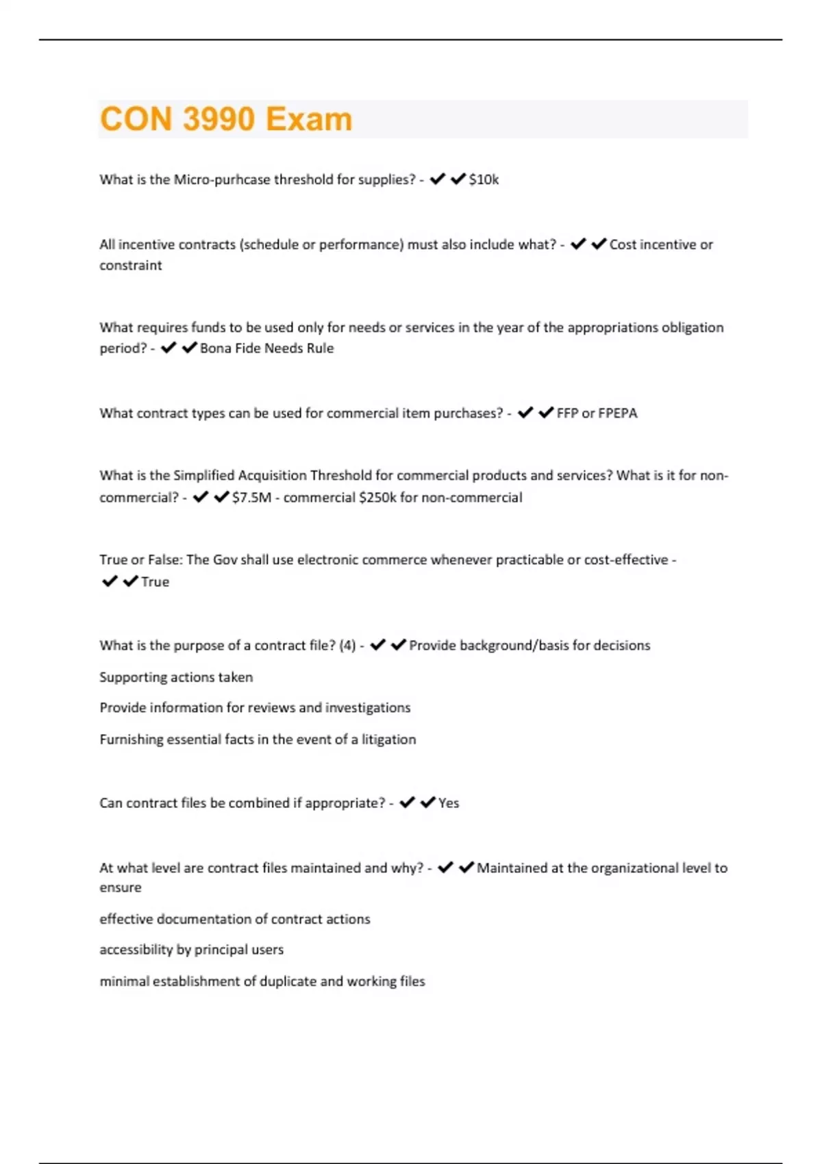 What is the Micro-purhcase threshold for supplies? - $10k All incentive contracts (schedule or performance) must also include what? - Cost incentive or constraint What requires funds to be used only for needs or services in the year of the appropriations obligation period? - Bona Fide Needs Rule What contract types can be used for commercial item purchases? - FFP or FPEPA What is the Simplified Acquisition Threshold for commercial products and services? What is it for noncommercial? - $7.5M - commercial $250k for non-commercial True or False: The Gov shall use electronic commerce whenever practicable or cost-effective - True What is the purpose of a contract file? (4) - Provide background/basis for decisions Supporting actions taken Provide information for reviews and investigations Furnishing essential facts in the event of a litigation Can contract files be combined if appropriate? - Yes At what level are contract files maintained and why? - Maintained at the organizational level to ensure effective documentation of contract actions accessibility by principal users minimal establishment of duplicate and working filessafeguarding classified docs conformance with agency regs When is a SAP contract file closed out? - When the KO receives evidence of receipt of property or final payment When is a FFP (not SAP) contract file closed out? - Should be closed out within 6 months after date KO receives evidence of physical completion