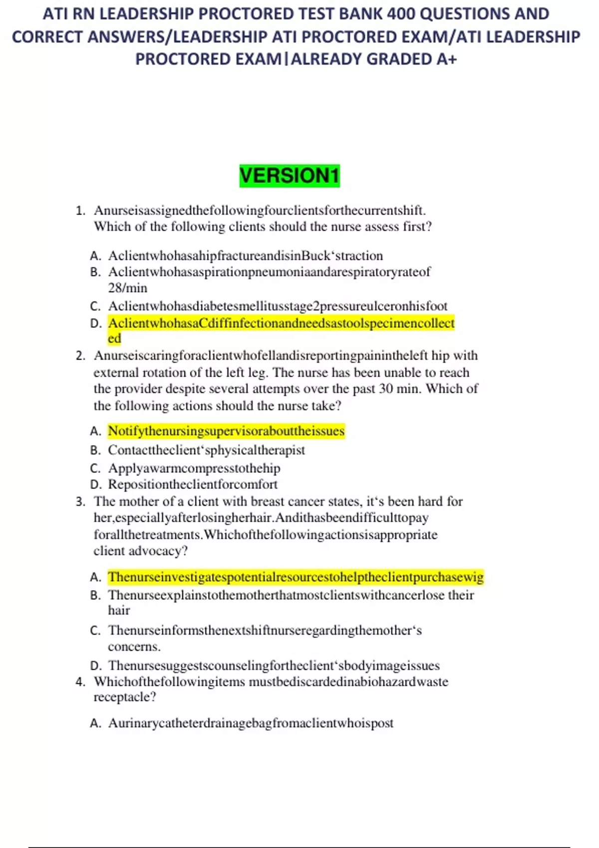 , ATI RN LEADERSHIP PROCTORED TEST BANK 400 QUESTIONS AND