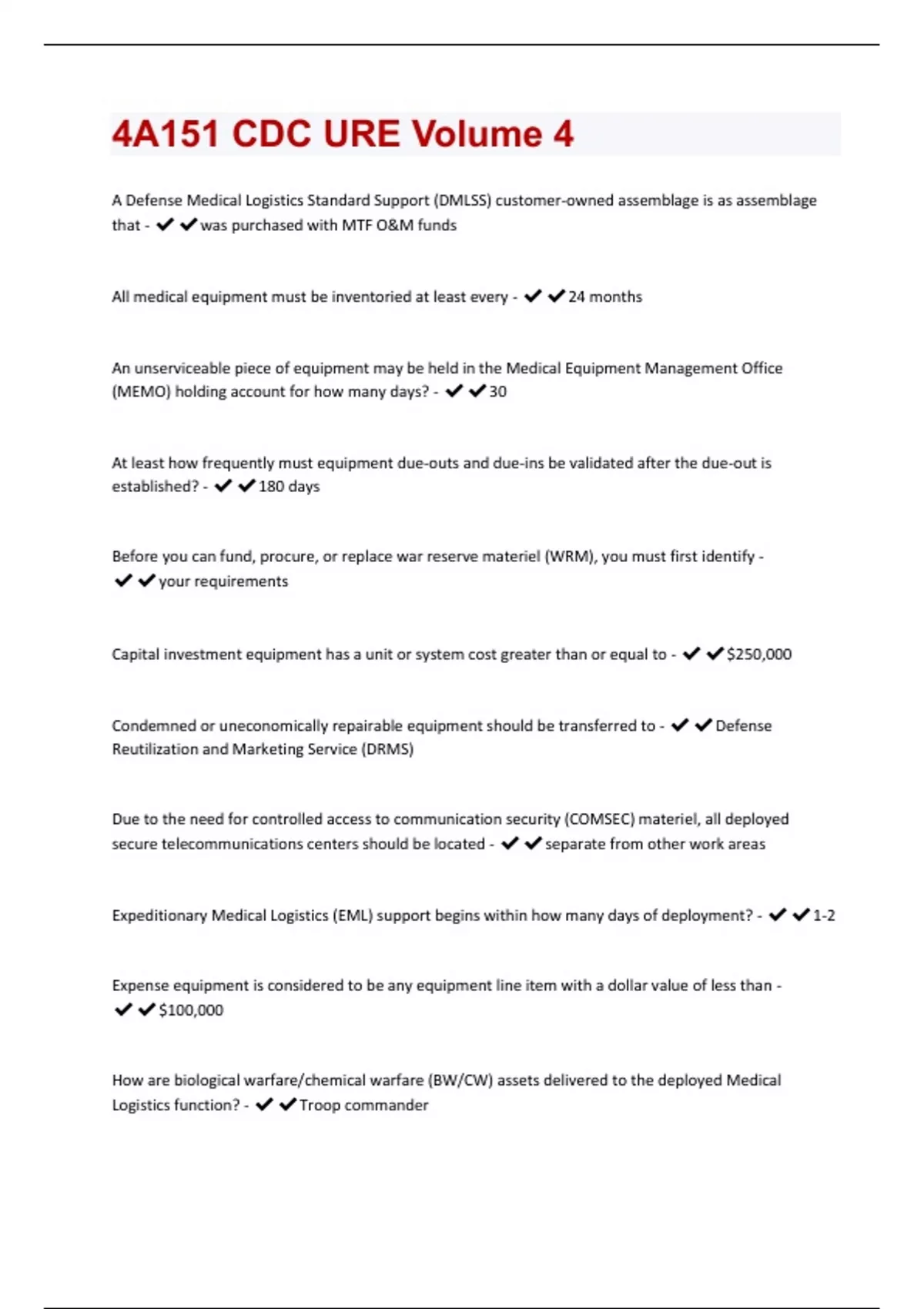 A Defense Medical Logistics Standard Support (DMLSS) customer-owned assemblage is as assemblage that - was purchased with MTF O&M funds All medical equipment must be inventoried at least every - 24 months An unserviceable piece of equipment may be held in the Medical Equipment Management Office (MEMO) holding account for how many days? - 30 At least how frequently must equipment due-outs and due-ins be validated after the due-out is established? - 180 days Before you can fund, procure, or replace war reserve materiel (WRM), you must first identify - your requirements Capital investment equipment has a unit or system cost greater than or equal to - $250,000 Condemned or uneconomically repairable equipment should be transferred to - Defense Reutilization and Marketing Service (DRMS) Due to the need for controlled access to communication security (COMSEC) materiel, all deployed secure telecommunications centers should be located - separate from other work areas Expeditionary Medical Logistics (EML) support begins within how many days of deployment? - 1-2 Expense equipment is considered to be any equipment line item with a dollar value of less than - $100,000 How are biological warfare/chemical warfare (BW/CW) assets delivered to the deployed Medical Logistics function? - Troop commanderHow are military war reserve materiel (WRM) projects identified in an allowance standard (AS)? - Three-position numeric code How are you notified when a received war reserve materiel (WRM) item is flagged as having a quality assurance (QA) alert? - ASSEMBLAGE MANAGEMENT INBOX How does a troop commander complete the biological warfare/chemical warfare (BW/CW) audit trail? - Return documentation to the home station MEDLOG