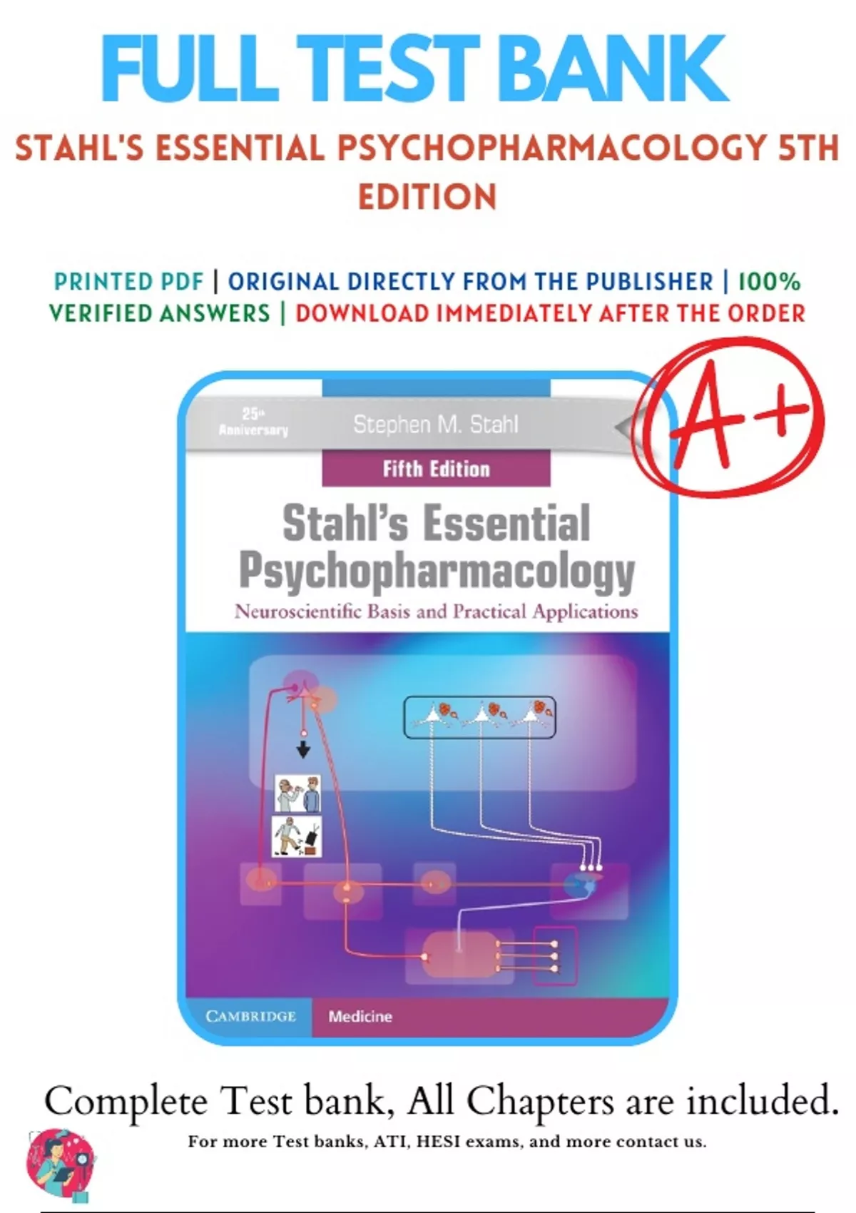 Test Bank For Stahls Essential Psychopharmacology 5th Edition Stephen M. Stahl | 9781108838573 | Chapter 1-13 | All Chapters with Answers and Rationals. Instant Delivery .
