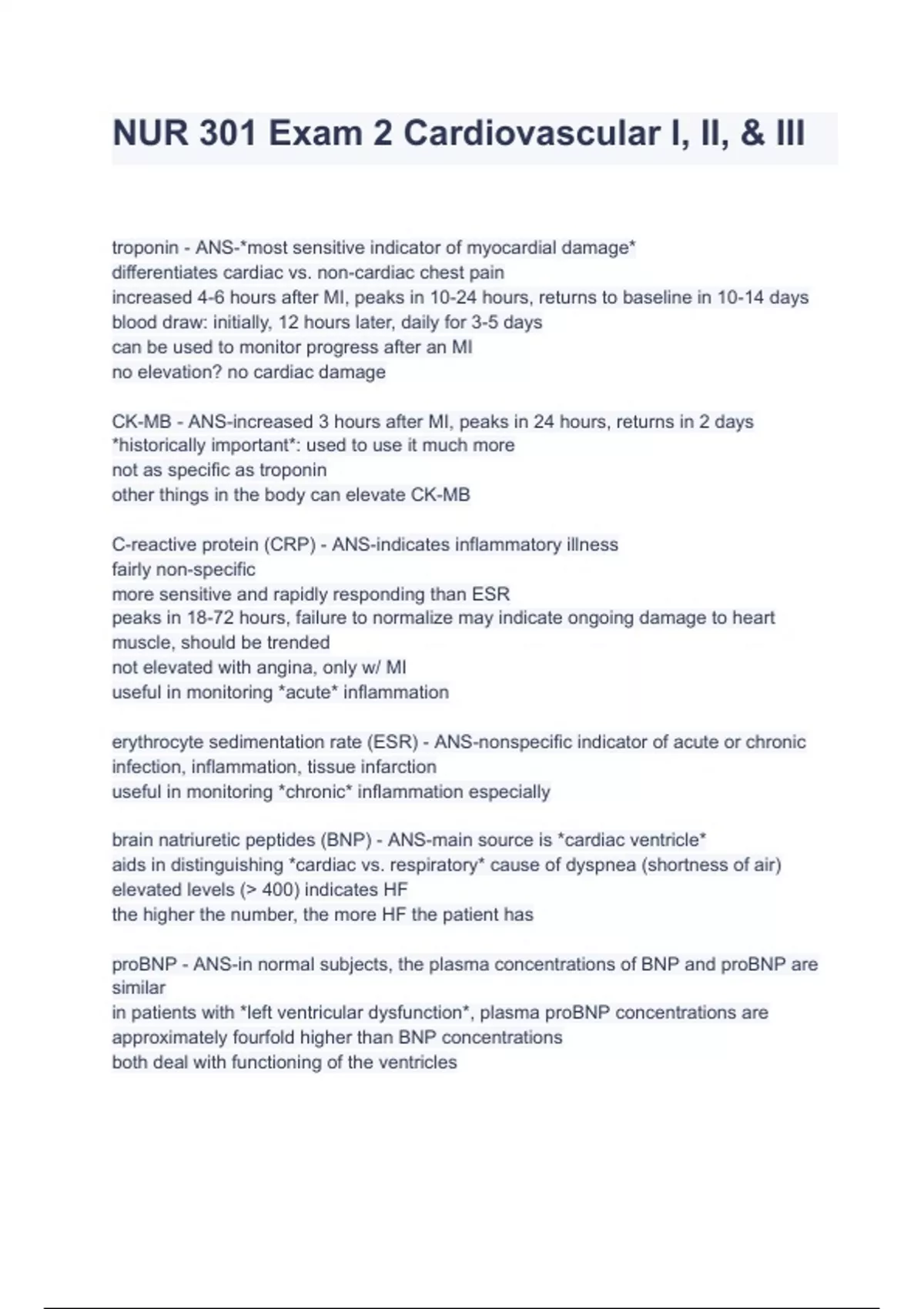 NUR 301 Exam 2 Cardiovascular I, II, & III