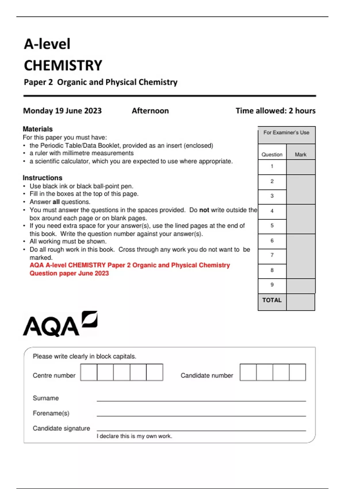 AQA A-level CHEMISTRY Paper 2 Organic and Physical Chemistry Question paper June 2023