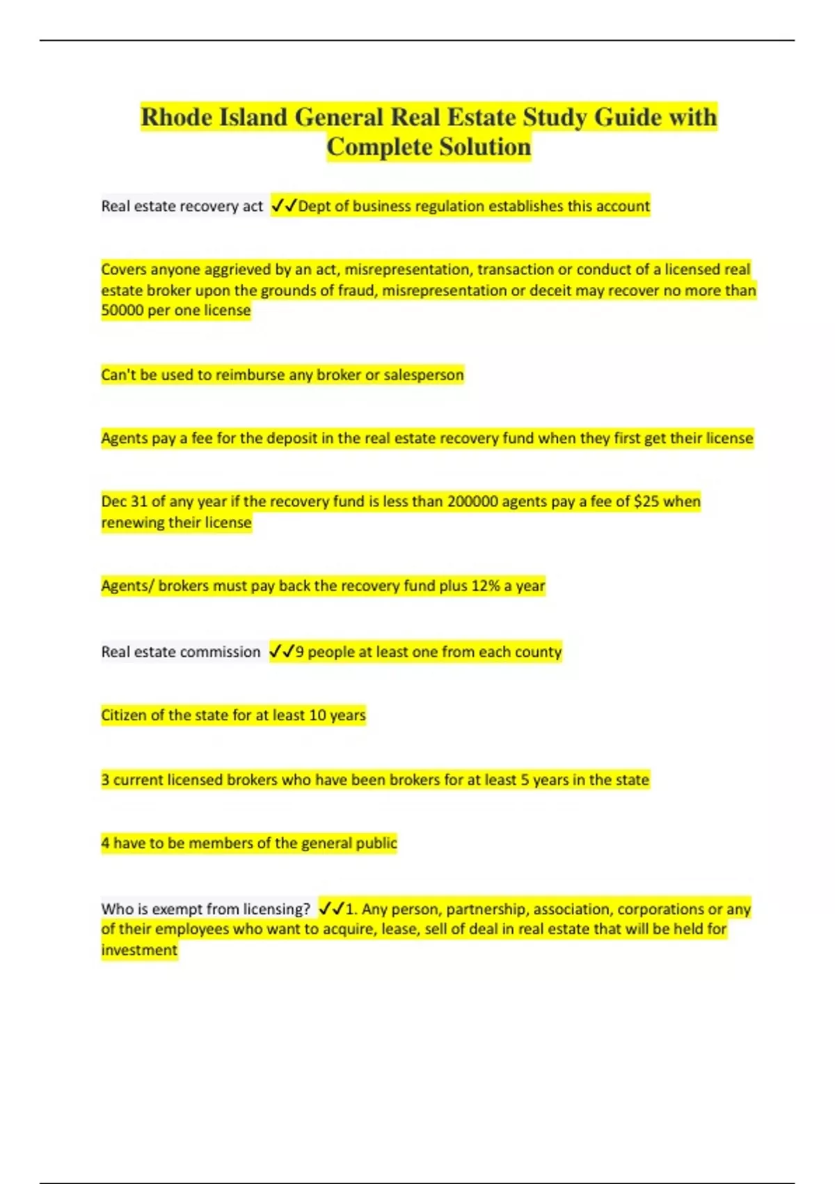 Rhode Island General Real Estate Study Guide Questions with Complete Solution