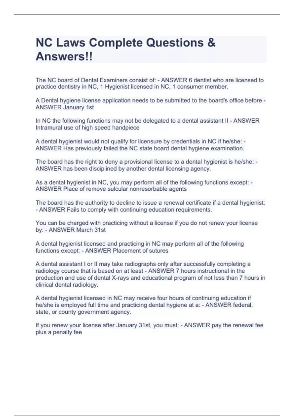 The NC board of Dental Examiners consist of: - ANSWER 6 dentist who are licensed to practice dentistry in NC, 1 Hygienist licensed in NC, 1 consumer member. A Dental hygiene license application needs to be submitted to the board's office before - ANSWER January 1st In NC the following functions may not be delegated to a dental assistant II - ANSWER Intramural use of high speed handpiece A dental hygienist would not qualify for licensure by credentials in NC if he/she: - ANSWER Has previously failed the NC state board dental hygiene examination. The board has the right to deny a provisional license to a dental hygienist is he/she: - ANSWER has been disciplined by another dental licensing agency. As a dental hygienist in NC, you may perform all of the following functions except: - ANSWER Place of remove sulcular nonresorbable agents The board has the authority to decline to issue a renewal