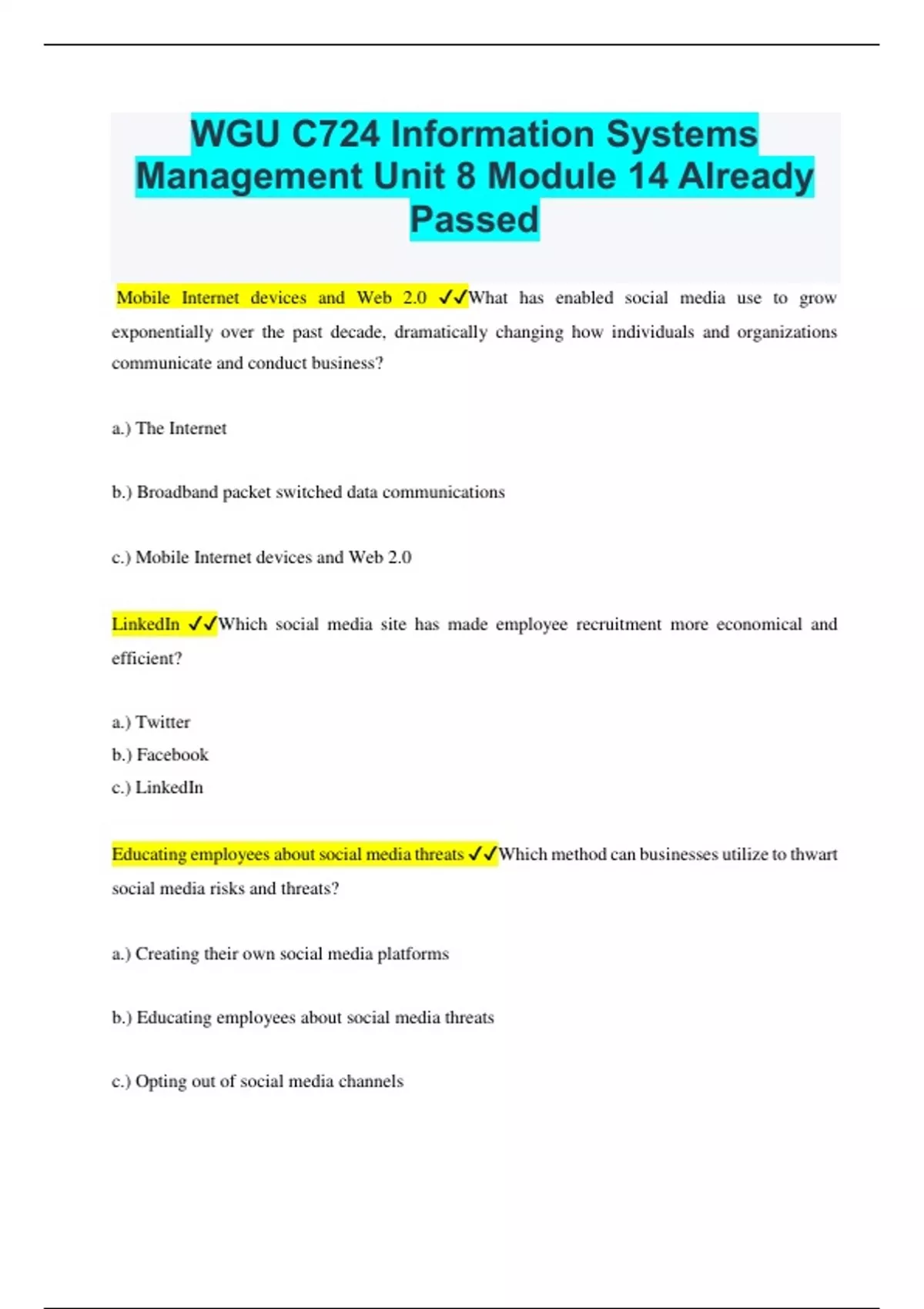 WGU C724 Information Systems Management Unit 8 Module 14 Already Passed Mobile Internet devices and Web 2.0 What has enabled social media use to grow exponentially over the past decade, dramatically changing how individuals and organizations communicate and conduct business? a.) The Internet b.) Broadband packet switched data communications c.) Mobile Internet devices and Web 2.0 LinkedIn Which social media site has made employee recruitment more economical and efficient? a.) Twitter b.) Facebook c.) LinkedIn Educating employees about social media threats Which method can businesses utilize to thwart social media risks and threats? a.) Creating their own social media platforms b.) Educating employees about social media threats c.) Opting out of social media channels