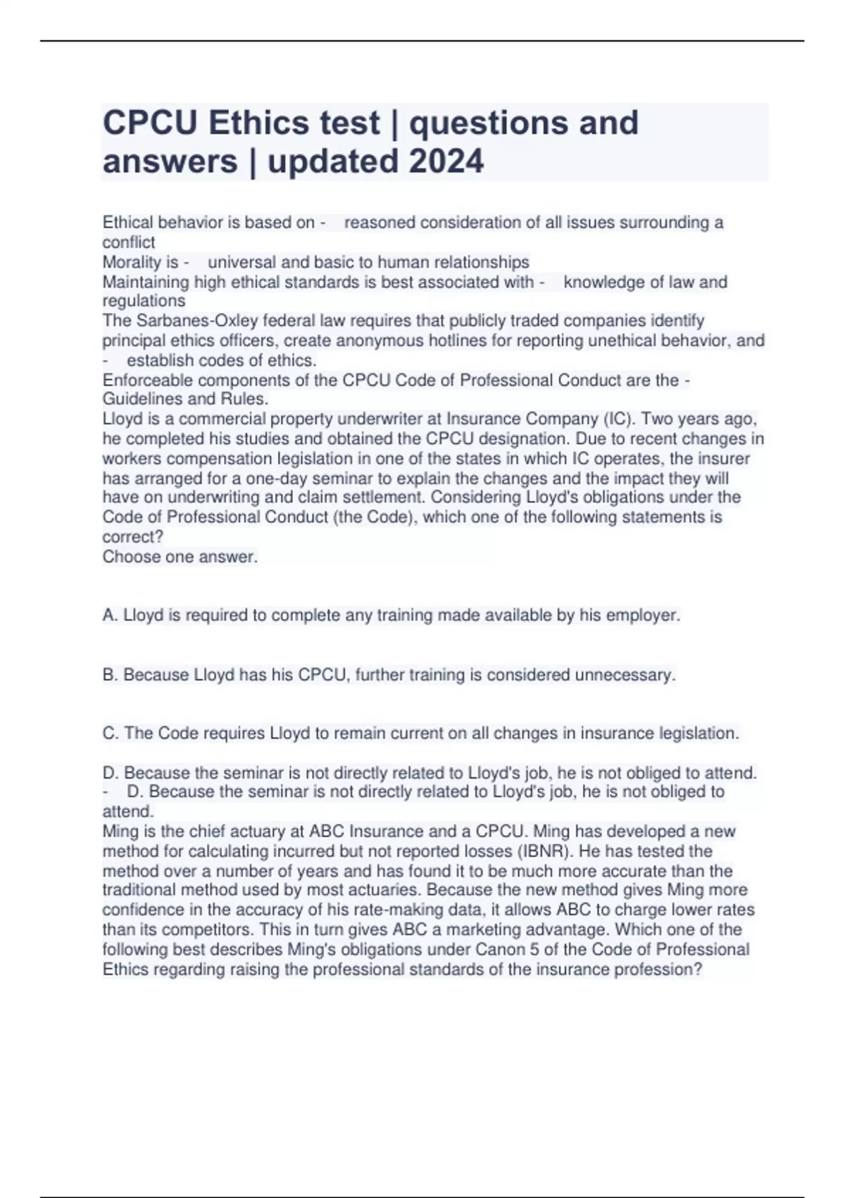 CPCU Ethics test | questions and answers | updated 2024