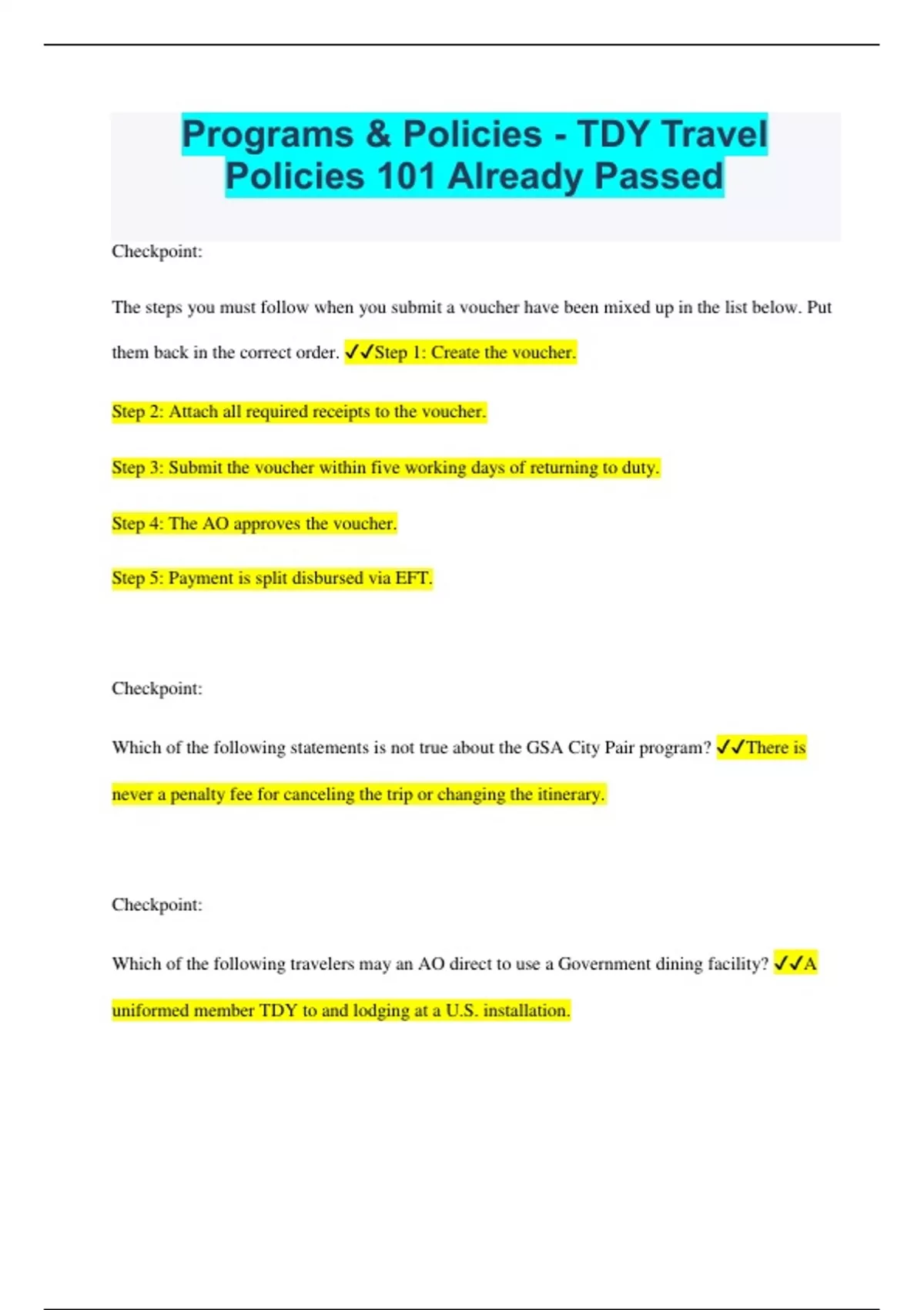 Programs & Policies - TDY Travel Policies 101 Already Passed Checkpoint: The steps you must follow when you submit a voucher have been mixed up in the list below. Put them back in the correct order. Step 1: Create the voucher. Step 2: Attach all required receipts to the voucher. Step 3: Submit the voucher within five working days of returning to duty. Step 4: The AO approves the voucher. Step 5: Payment is split disbursed via EFT. Checkpoint: Which of the following statements is not true about the GSA City Pair program? There is never a penalty fee for canceling the trip or changing the itinerary. Checkpoint: Which of the following travelers may an AO direct to use a Government dining facility? A uniformed member TDY to and lodging at a U.S. installation. What is not true about DoD travel policy? An AO can approve payment for items not addressed by the JTR. When the AO approves a rental car for the traveler's use at the TDY location, which of the following is not a valid use of that official rental car? Travel to visit relatives on non-duty days. What is not true about booking official flights? You should always try to select the least expensive flight. What is one of the advantages of the GSA City Pair flights? Discounted, capacity-controlled seats are available on every flight. Which of the following statements about using a POV on official travel is true? If official travelers ride together, only the traveler paying the vehicle operating expenses can claim a mileage allowance. All of the following individuals are going TDY to U.S. installations. The AO can direct most of them to use Government quarters or privatized lodging, but which individual is not required to stay in either Government quarters or privatized lodging? A DoD civilian employee at a non-ILP location Which of the following is not included in the per diem rate when traveling in CONUS? Lodging tax A uniformed member is TDY to a U.S. installation, will be staying in Government quarters, and has all three meals available in a Government dining facility. Which meal rate will apply to the traveler? Government Meal Rate Which statements is not true about receipts? You must supply receipts for all trip expenses you claimed on the voucher. Which of the following statements is true? The JTR must mention an item in order for the AO to approve you to receive reimbursement for it.