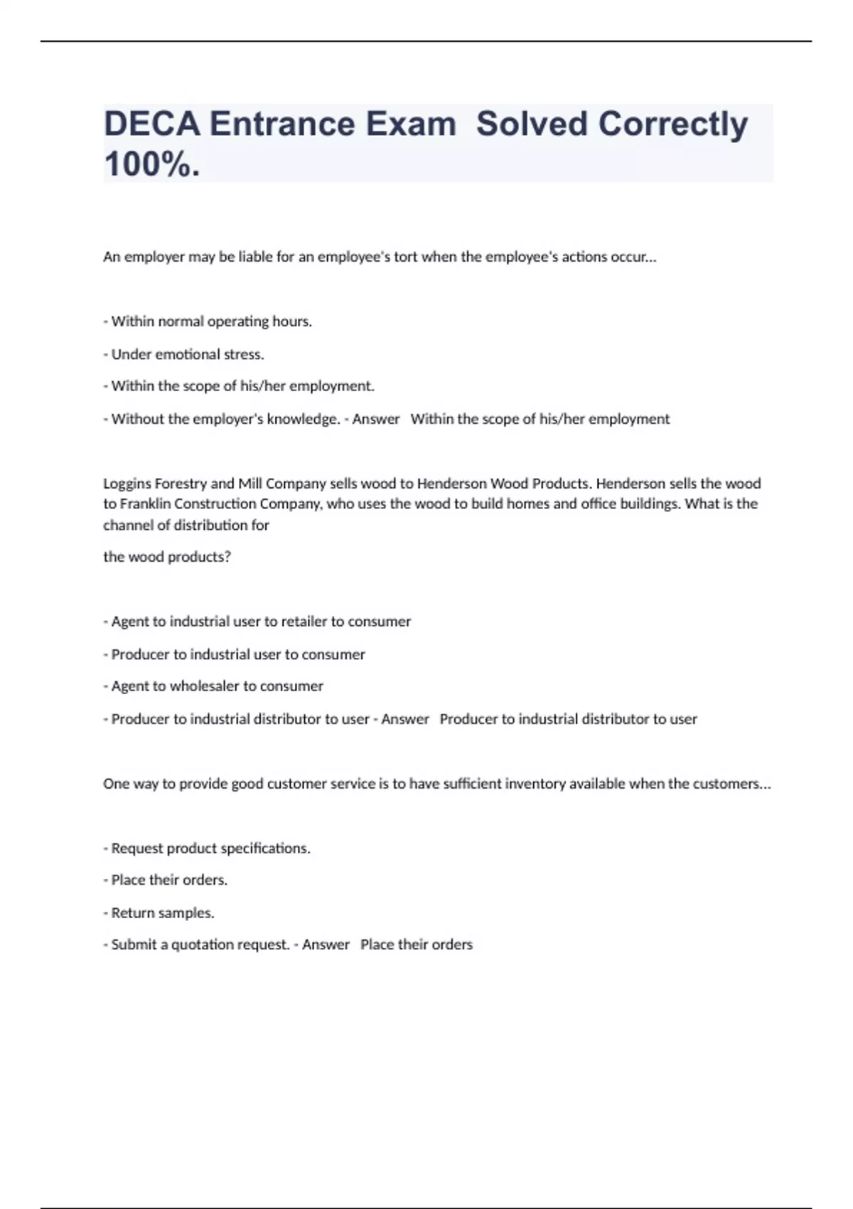 An employer may be liable for an employee's tort when the employee's actions occur... - Within normal operating hours. - Under emotional stress. - Within the scope of his/her employment. - Without the employer's knowledge. - Answer Within the scope of his/her employment Loggins Forestry and Mill Company sells wood to Henderson Wood Products. Henderson sells the wood to Franklin Construction Company, who uses the wood to build homes and office buildings. What is the channel of distribution for the wood products? - Agent to industrial user to retailer to consumer - Producer to industrial user to consumer - Agent to wholesaler to consumer - Producer to industrial distributor to user - Answer Producer to industrial distributor to user One way to provide good customer service is to have sufficient inventory available when the customers... - Request product specifications. - Place their orders. - Return samples. - Submit a quotation request. - Answer Place their orders