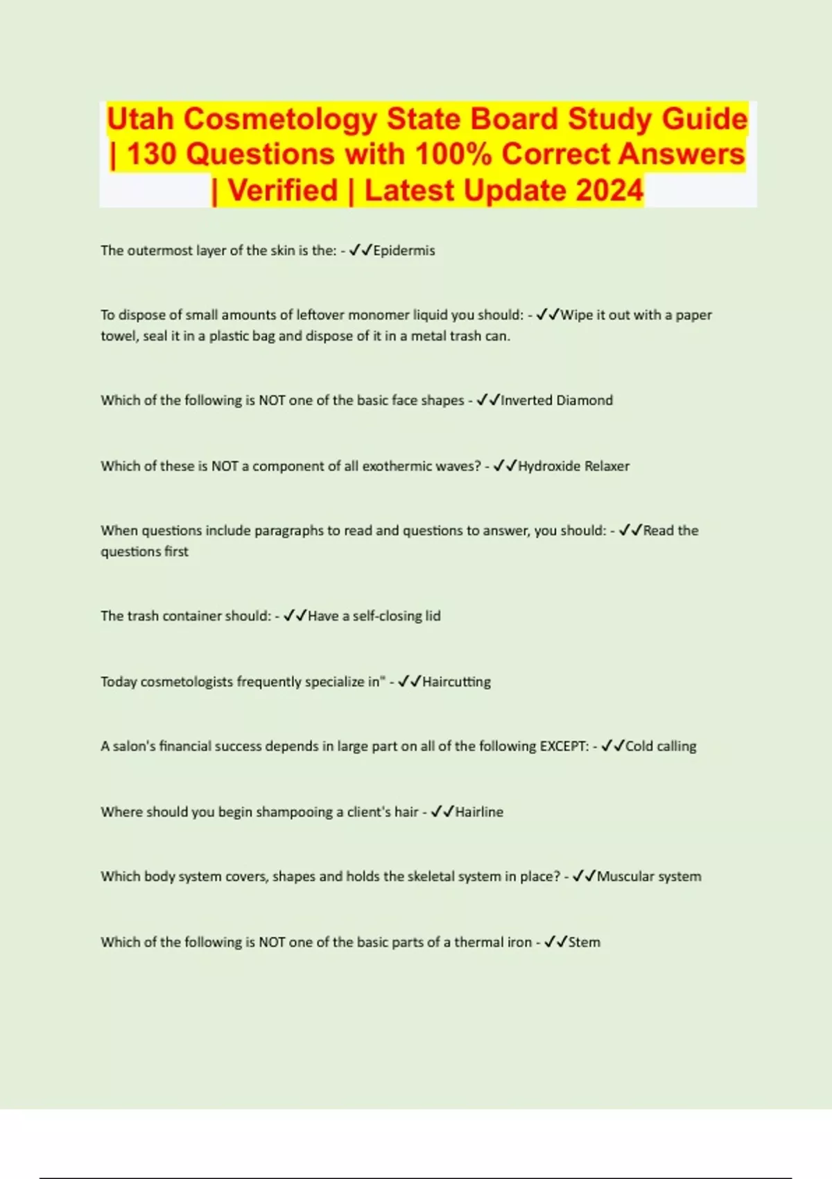 Utah Cosmetology State Board Study Guide | 130 Questions with 100% Correct Answers | Verified | Latest Update 2024