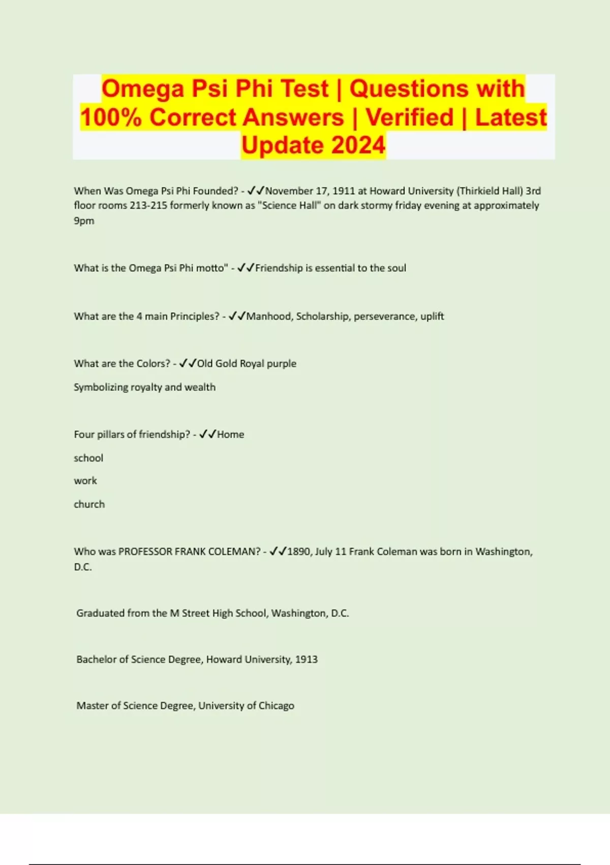 Omega Psi Phi Test | Questions with 100% Correct Answers | Verified | Latest Update 2024