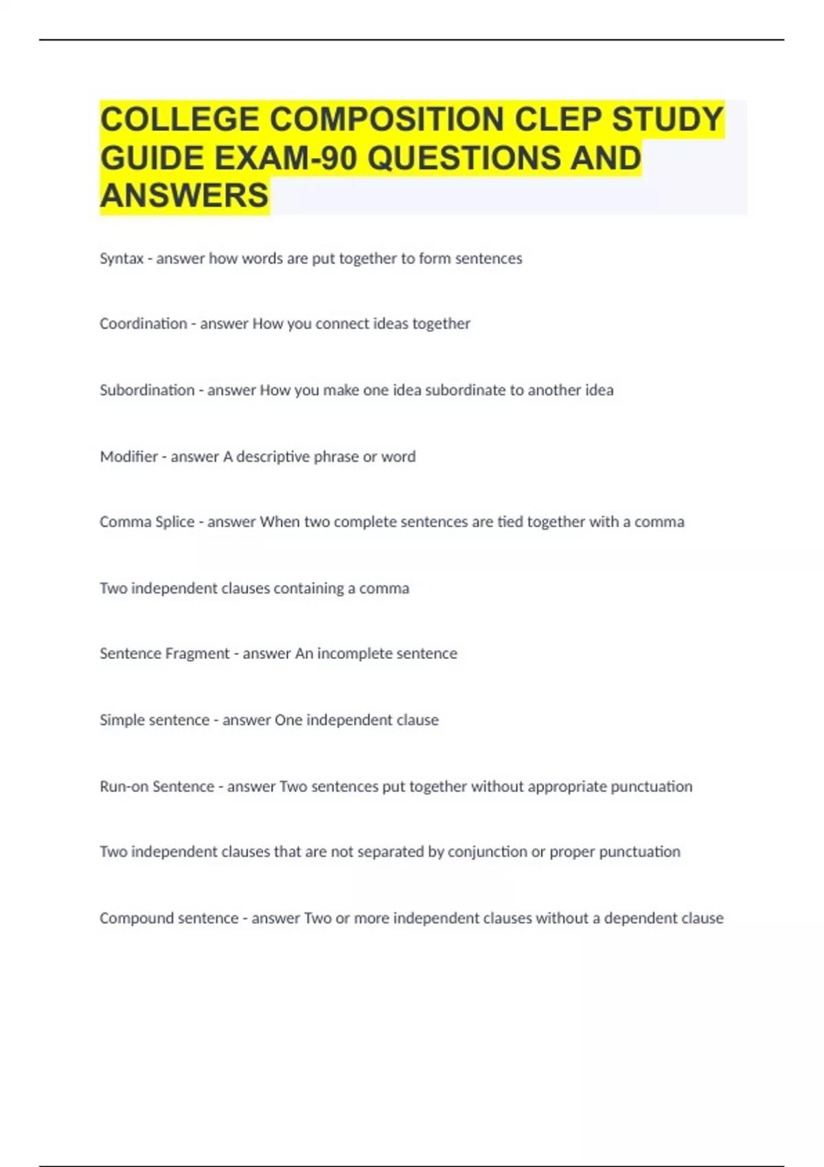 COLLEGE COMPOSITION CLEP STUDY GUIDE EXAM-90 QUESTIONS AND ANSWERS