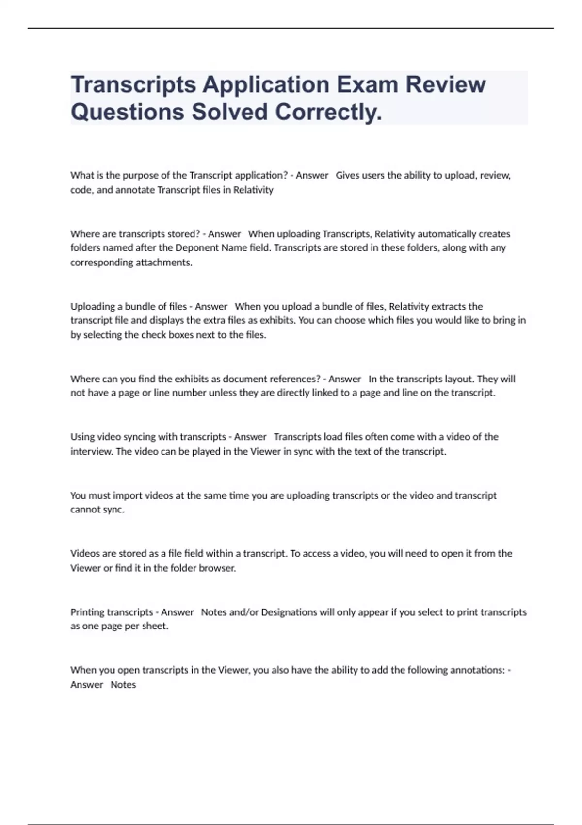What is the purpose of the Transcript application? - Answer Gives users the ability to upload, review, code, and annotate Transcript files in Relativity Where are transcripts stored? - Answer When uploading Transcripts, Relativity automatically creates folders named after the Deponent Name field. Transcripts are stored in these folders, along with any corresponding attachments. Uploading a bundle of files - Answer When you upload a bundle of files, Relativity extracts the transcript file and displays the extra files as exhibits. You can choose which files you would like to bring in by selecting the check boxes next to the files. Where can you find the exhibits as document references? - Answer In the transcripts layout. They will not have a page or line number unless they are directly linked to a page and line on the transcript. Using video syncing with transcripts - Answer Transcripts load files often come with a video of the interview. The video can be played in the Viewer in sync with the text of the transcript. You must import videos at the same time you are uploading transcripts or the video and transcript cannot sync. Videos are stored as a file field within a transcript. To access a video, you will need to open it from the Viewer or find it in the folder browser. Printing transcripts - Answer Notes and/or Designations will only appear if you select to print transcripts as one page per sheet. When you open transcripts in the Viewer, you also have the ability to add the following annotations: - Answer Notes