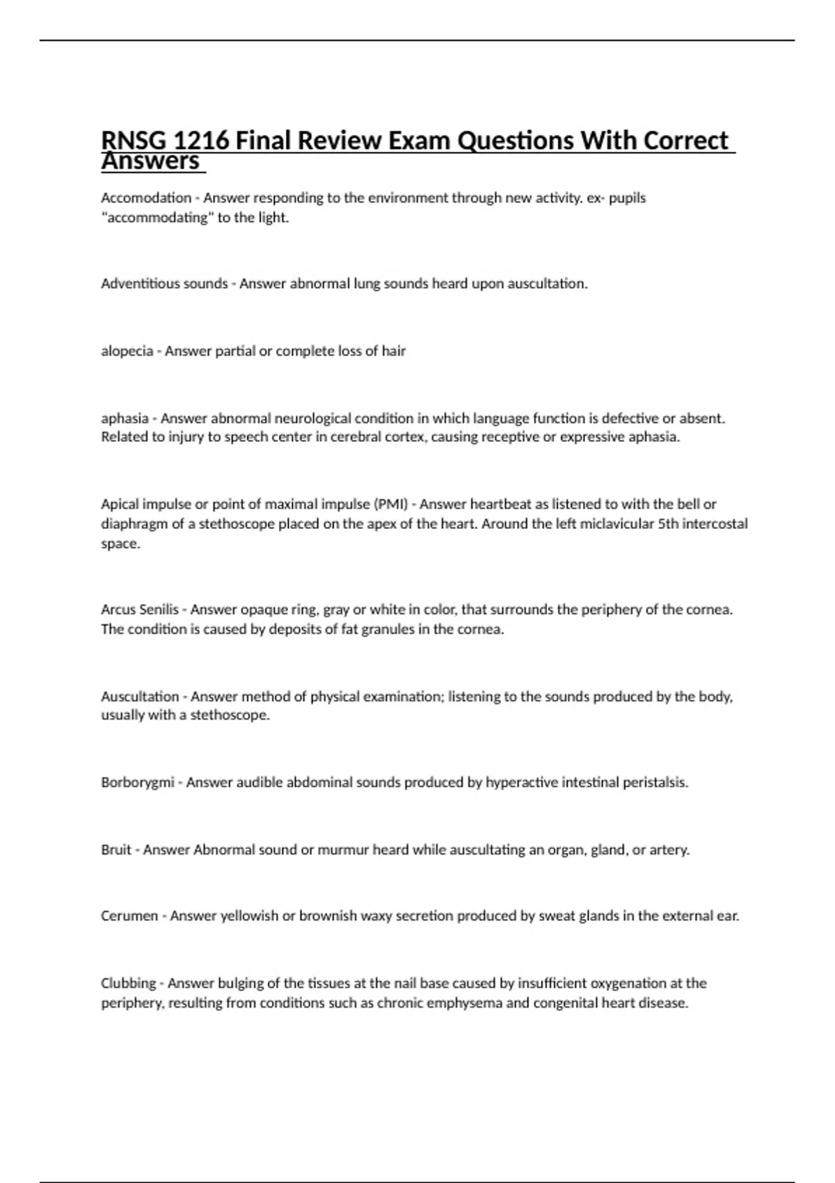 RNSG 1216 Final Review Exam Questions With Correct Answers