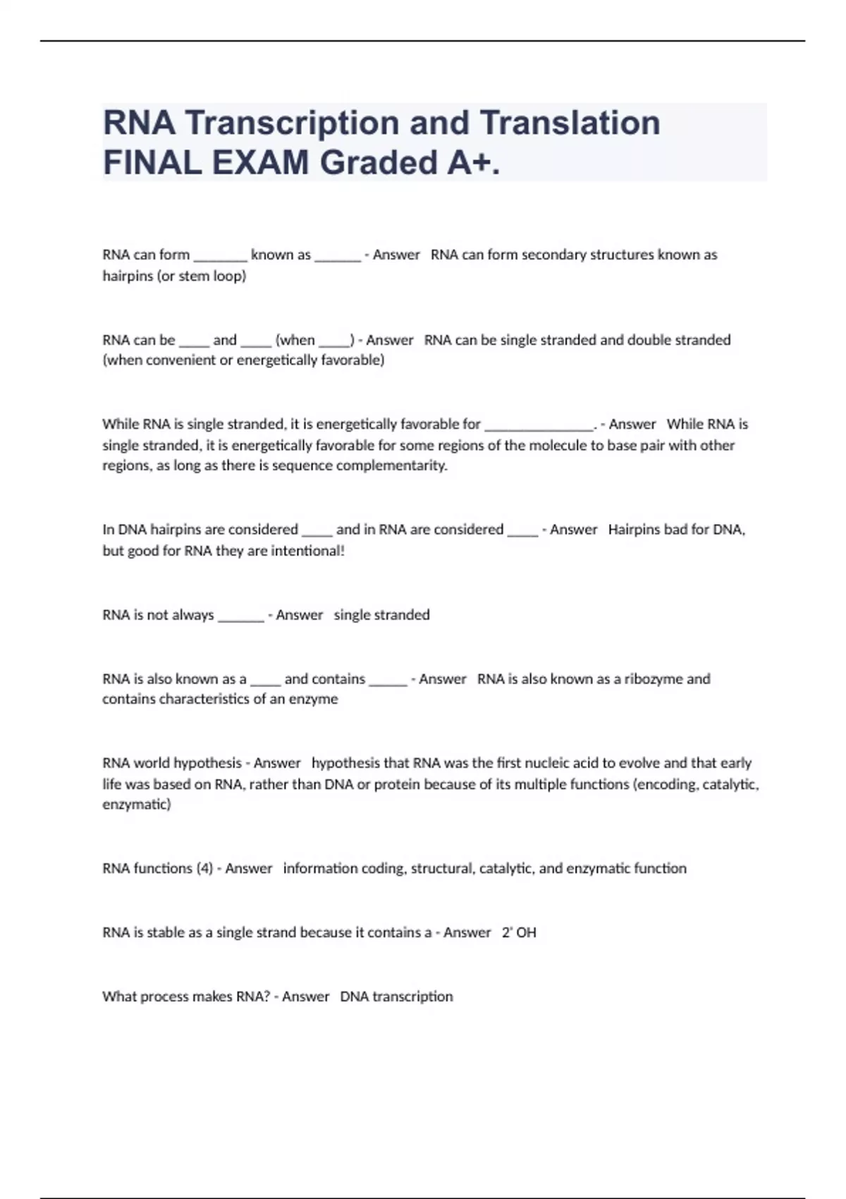 RNA Transcription and Translation FINAL EXAM Graded A+.