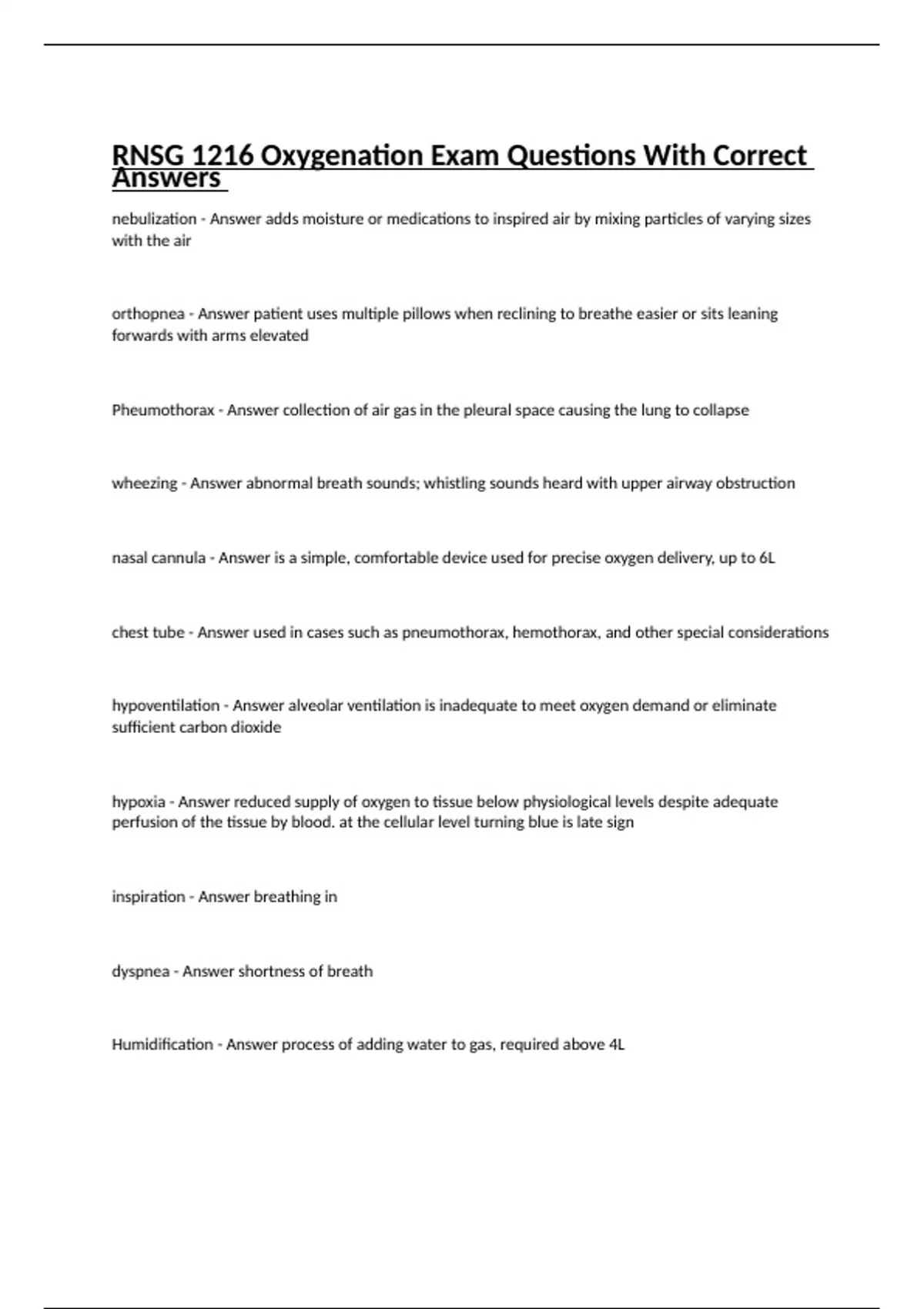 RNSG 1216 Oxygenation Exam Questions With Correct Answers