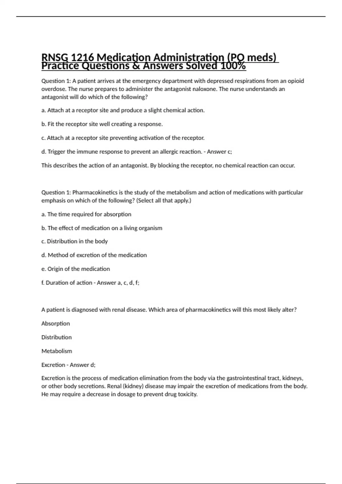 RNSG 1216 Medication Administration (PO meds) Practice Questions & Answers Solved 100%