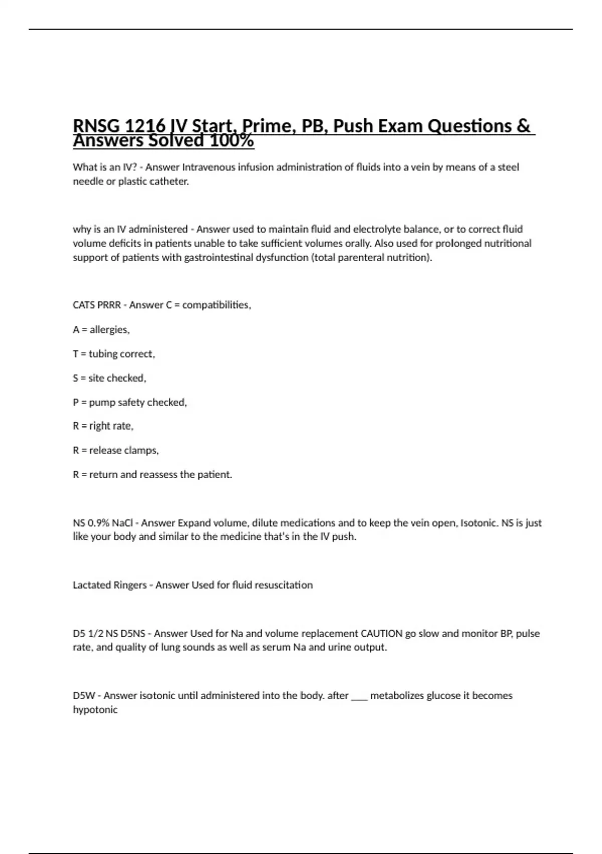 RNSG 1216 IV Start, Prime, PB, Push Exam Questions & Answers Solved 100%