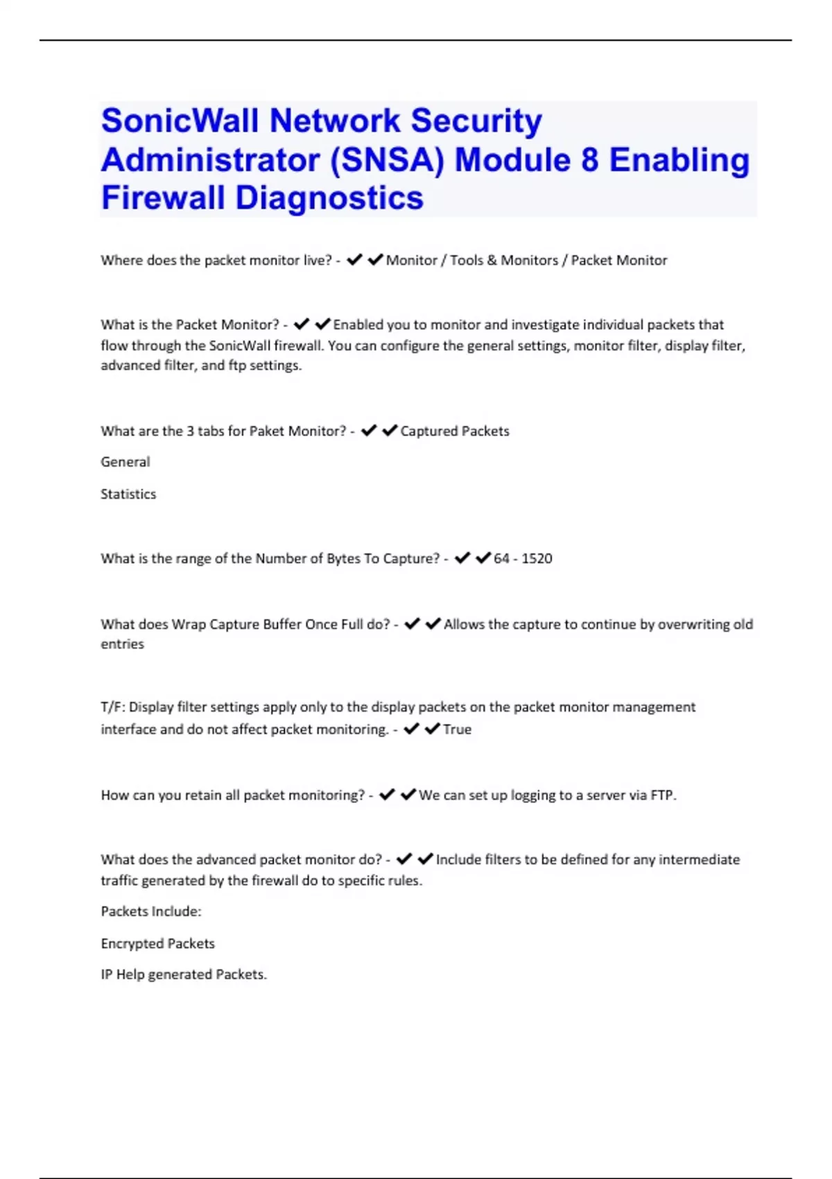 SonicWall Network Security Administrator (SNSA) Module 8 Enabling Firewall Diagnostics | 2024 Exam All Possible Questions and Answers with complete solution
