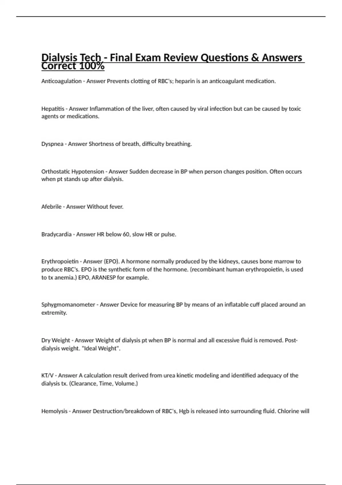 Dialysis Tech - Final Exam Review Questions & Answers Correct 100%