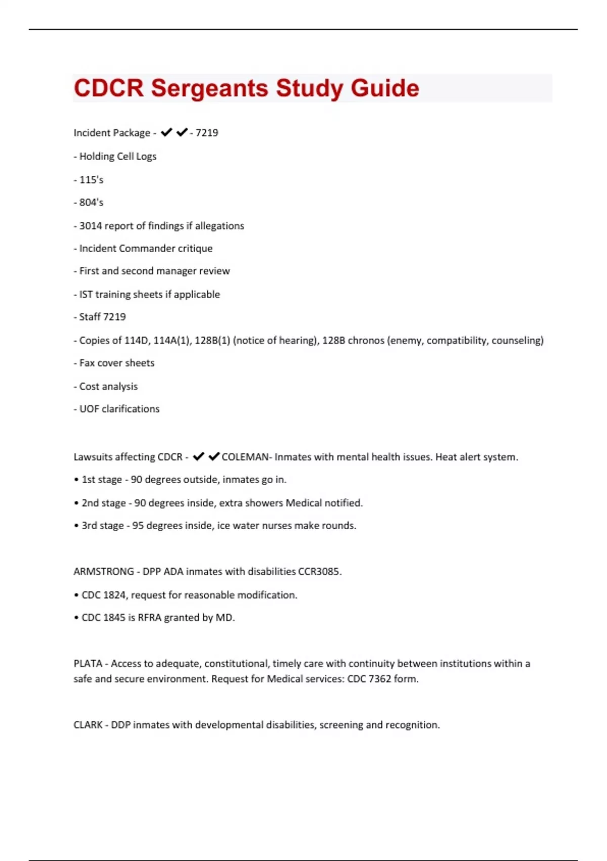 Incident Package - - 7219 - Holding Cell Logs - 115's - 804's - 3014 report of findings if allegations - Incident Commander critique - First and second manager review - IST training sheets if applicable - Staff 7219 - Copies of 114D, 114A(1), 128B(1) (notice of hearing), 128B chronos (enemy, compatibility, counseling) - Fax cover sheets - Cost analysis - UOF clarifications Lawsuits affecting CDCR - COLEMAN- Inmates with mental health issues. Heat alert system. • 1st stage - 90 degrees outside, inmates go in. • 2nd stage - 90 degrees inside, extra showers Medical notified. • 3rd stage - 95 degrees inside, ice water nurses make rounds. ARMSTRONG - DPP ADA inmates with disabilities CCR3085. • CDC 1824, request for reasonable modification. • CDC 1845 is RFRA granted by MD. PLATA - Access to adequate, constitutional, timely care with continuity between institutions within a safe and secure environment. Request for Medical services: CDC 7362 form. CLARK - DDP inmates with developmental disabilities, screening and recognition.PEREZ - Adequate dental care. VALDIVIA - Parole revocation process. MADRID - Madrid PBSP ad seg. Housing Codes - S - Single Cell Status R - Sex Offenders DDP DP* - Armstrong •DP* disability affecting placement. •DN* disability NOT affecting placement. •M- Mobility V- Vision H-Hearing W- Wheelchair •DPO - intermittent wheelchair needs