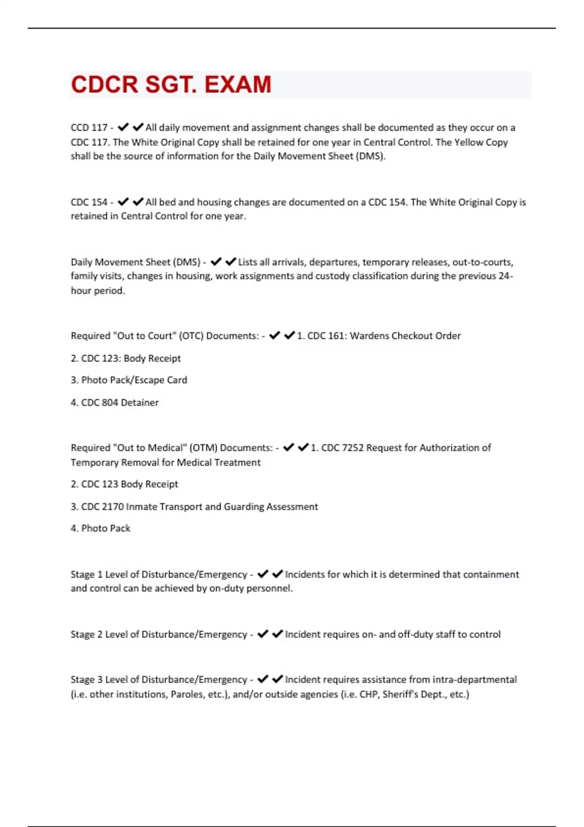 CCD 117 - All daily movement and assignment changes shall be documented as they occur on a CDC 117. The White Original Copy shall be retained for one year in Central Control. The Yellow Copy shall be the source of information for the Daily Movement Sheet (DMS). CDC 154 - All bed and housing changes are documented on a CDC 154. The White Original Copy is retained in Central Control for one year. Daily Movement Sheet (DMS) - Lists all arrivals, departures, temporary releases, out-to-courts, family visits, changes in housing, work assignments and custody classification during the previous 24- hour period. Required "Out to Court" (OTC) Documents: - 1. CDC 161: Wardens Checkout Order 2. CDC 123: Body Receipt 3. Photo Pack/Escape Card 4. CDC 804 Detainer Required "Out to Medical" (OTM) Documents: - 1. CDC 7252 Request for Authorization of Temporary Removal for Medical Treatment 2. CDC 123 Body Receipt 3. CDC 2170 Inmate Transport and Guarding Assessment 4. Photo Pack Stage 1 Level of Disturbance/Emergency - Incidents for which it is determined that containment and control can be achieved by on-duty personnel. Stage 2 Level of Disturbance/Emergency - Incident requires on- and off-duty staff to control Stage 3 Level of Disturbance/Emergency - Incident requires assistance from intra-departmental (i.e. other institutions, Paroles, etc.), and/or outside agencies (i.e. CHP, Sheriff's Dept., etc.)Stage 4 Level of Disturbance/Emergency - Incident requires assistance from the Office of Emergency Services (OES), National Guard, etc. Level 1 (I) Inmate Classification - 0-18 Points: Open Dorm without armed perimeter. Level 2 (II) Inmate Classification - 19-35 Points: Open dorm with secure perimeter. Level 3 (III) Inmate Classification - 36-59 Points: Cell construction with fenced perimeter and armed coverage. Level 4 (IV) Inmate Classification - 60+ Points: 1. Secure perimeter 2. Inside/Outside armed coverage 3. Inside Cell Construction/Outside Cell Construction CCR 3084 - 602 I/M Appeal CCR 3084 (602 I/M Appeal) Exceptions To Time Limits - 1. Unavailability of the I/M, staff or witnesses. 2. Complexity of the decision, action, or policy requiring additional research. 3. Necessary involvement of other agencies or jurisdictions. 4. State of Emergency pursuant to CCR 3383(c) requiring the postponement of nonessential administrative decisions and actions including normal time requirements for such decisions and actions. CCR 3084 I/M Appeal 1st Level: - 30 Working Days Usually Heard by Facility Supervisor CCR 3084 I/M Appeal 2nd Level: - 30 Working Days