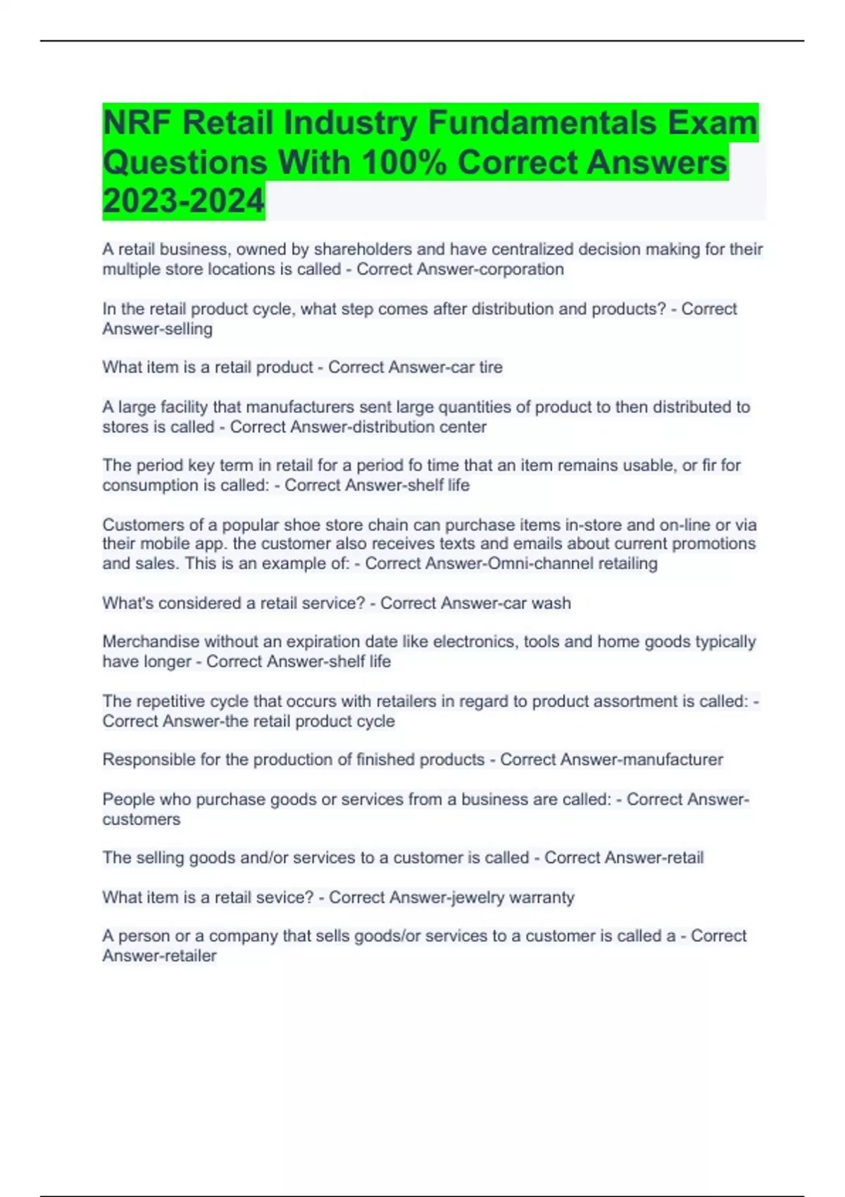 NRF Retail Industry Fundamentals Exam Questions With 100% Correct Answers