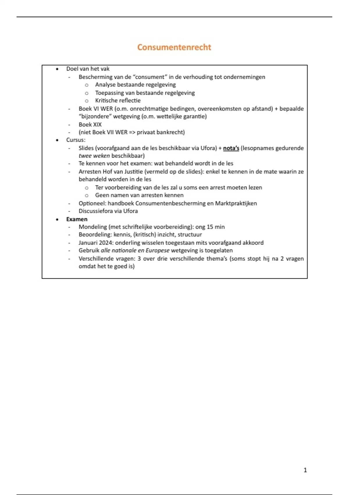 Dit vak is een volledige samenvatting van consumentenrecht, gedoceerd door Prof. Steennot aan de UGent. De samenvatting bevat alle slides en lesnotities. Ik was in eerste zit geslaagd met 18/20.