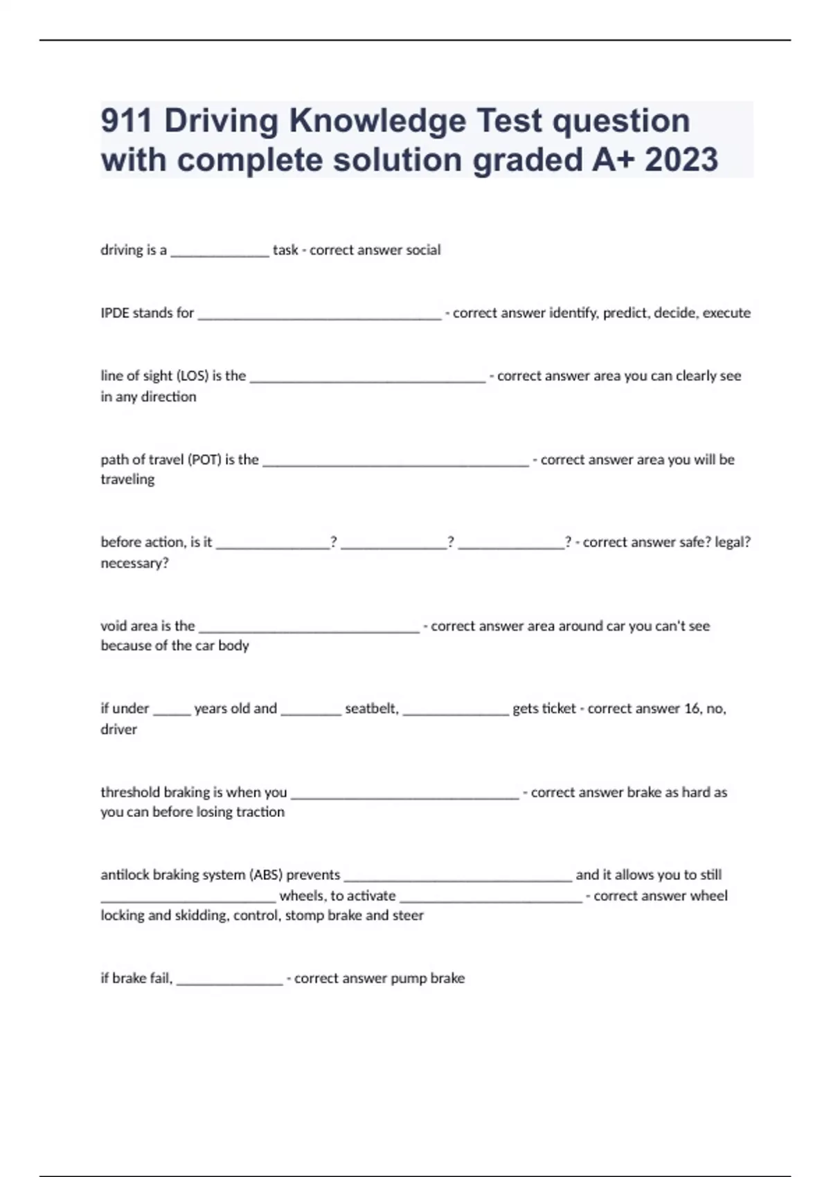 911 Driving Knowledge Test question with complete solution graded A+ 2023/2024driving is a _____________ task - correct answer social IPDE stands for ________________________________ - correct answer identify, predict, decide, execute line of sight (LOS) is the _______________________________ - correct answer area you can clearly see in any direction path of travel (POT) is the ___________________________________ - correct answer area you will be traveling before action, is it _______________? ______________? ______________? - correct answer safe? legal? necessary? void area is the _____________________________ - correct answer area around car you can't see because of the car body