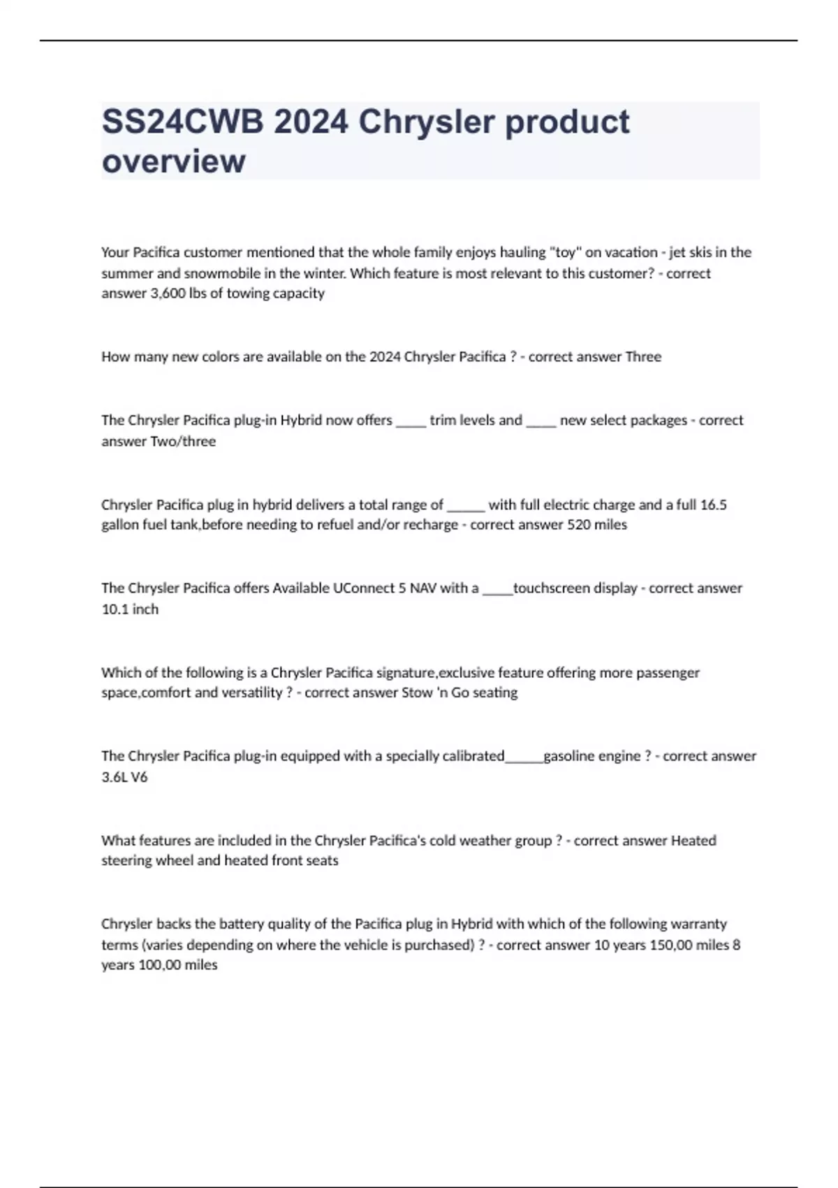 SS24CWB 2024 Chrysler product overviewYour Pacifica customer mentioned that the whole family enjoys hauling "toy" on vacation - jet skis in the summer and snowmobile in the winter. Which feature is most relevant to this customer? - correct answer 3,600 lbs of towing capacity How many new colors are available on the 2024 Chrysler Pacifica ? - correct answer Three The Chrysler Pacifica plug-in Hybrid now offers ____ trim levels and ____ new select packages - correct answer Two/three Chrysler Pacifica plug in hybrid delivers a total range of _____ with full electric charge and a full 16.5 gallon fuel tank,before needing to refuel and/or recharge - correct answer 520 miles The Chrysler Pacifica offers Available UConnect 5 NAV with a ____touchscreen display - correct answer 10.1 inch Which of the following is a Chrysler Pacifica signature,exclusive feature offering more passenger space,comfort and versatility ? - correct answer Stow 'n Go seating The Chrysler Pacifica plug-in equipped with a specially calibrated_____gasoline engine ? - correct answer 3.6L V6 What features are included in the Chrysler Pacifica's cold weather group ? - correct answer Heated steering wheel and heated front seats Chrysler backs the battery quality of the Pacifica plug in Hybrid with which of the following warranty terms (varies depending on where the vehicle is purchased) ? - correct answer 10 years 150,00 miles 8 years 100,00 miles Chrysler Pacifica has the most standard _____ features in its class - correct answer Safety and security sales consultant have easy access via smartphone, tablet or laptop to the ______ anytime to get details on a vehicle's "what's new","why buys" & model highlights - correct answer Flip app The Pacifica customers you're speaking with mentioned they have three children all under the age of 7. Which standard feature would benefit most ? - correct answer Power side-sliding doors and lift gate