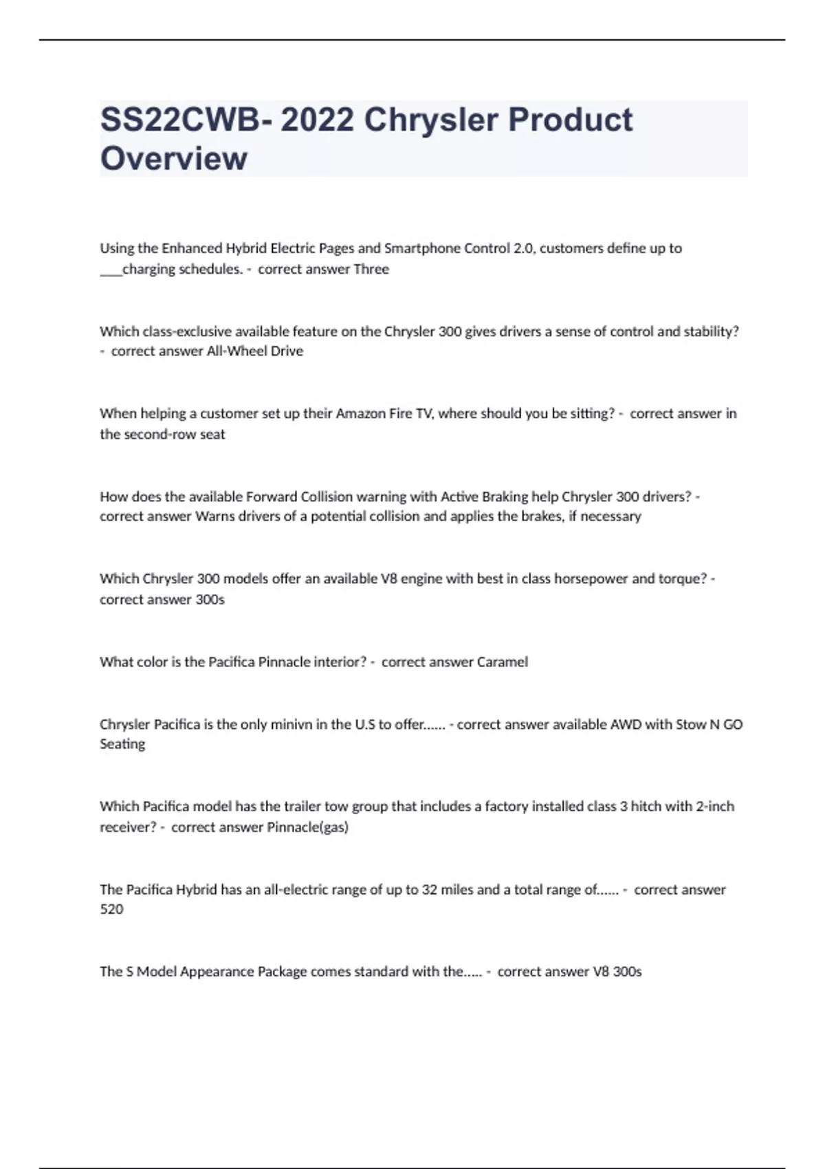 SS22CWB- 2022 Chrysler Product OverviewUsing the Enhanced Hybrid Electric Pages and Smartphone Control 2.0, customers define up to ___charging schedules. - correct answer Three Which class-exclusive available feature on the Chrysler 300 gives drivers a sense of control and stability? - correct answer All-Wheel Drive When helping a customer set up their Amazon Fire TV, where should you be sitting? - correct answer in the second-row seat How does the available Forward Collision warning with Active Braking help Chrysler 300 drivers? - correct answer Warns drivers of a potential collision and applies the brakes, if necessary Which Chrysler 300 models offer an available V8 engine with best in class horsepower and torque? - correct answer 300s What color is the Pacifica Pinnacle interior? - correct answer Caramel Chrysler Pacifica is the only minivn in the U.S to offer...... - correct answer available AWD with Stow N GO Seating Which Pacifica model has the trailer tow group that includes a factory installed class 3 hitch with 2-inch receiver? - correct answer Pinnacle(gas) The Pacifica Hybrid has an all-electric range of up to 32 miles and a total range of...... - correct answer 520 The S Model Appearance Package comes standard with the..... - correct answer V8 300s The Comfort Group (AGF), which is optional on Touring-L and 300S, now includes a....... - correct answer Deluxe Security Alarm The Chrysler Clean Air Filtration System is standard on.... - correct answer All Chrysler Models Pacifica's Rear Seat Entertainment with Amazon Fire TV can be watched by..... - correct answer rear-seat passengers What are the terms for the pacifica Hybrid Battery warranty in the 14 TZEV states? - correct answer 10 years/150,000 miles Chrysler Pacifica has ..............standard and available safety and security features. - correct answer more than 115 Which of the following is NOT a Pacifica Hybrid model for 2022? - correct answer Touring Pacifica's Uconnect 5 radio has the largest standard ..... in its class. - correct answer Touchscreen The available V8 engine on the Chrysler 300s has a Best-in-Class........ - correct answer 363 horsepower Which package now includes Rear Seat Entertainment with Amazon Fire TV with apps and streaming, Blu-ray/DVD player, Connected Vehicle, FamCam interior Camera, Keysense, Stow'n Vac, hands-free doors/liftgate, heated second row seats, and second row one touch windows? - correct answer Family Comfort Group How do you pair the Alexa remotes with the Amazon Fire TV displays? - correct answer Hold down the remote's home button for 10 seconds