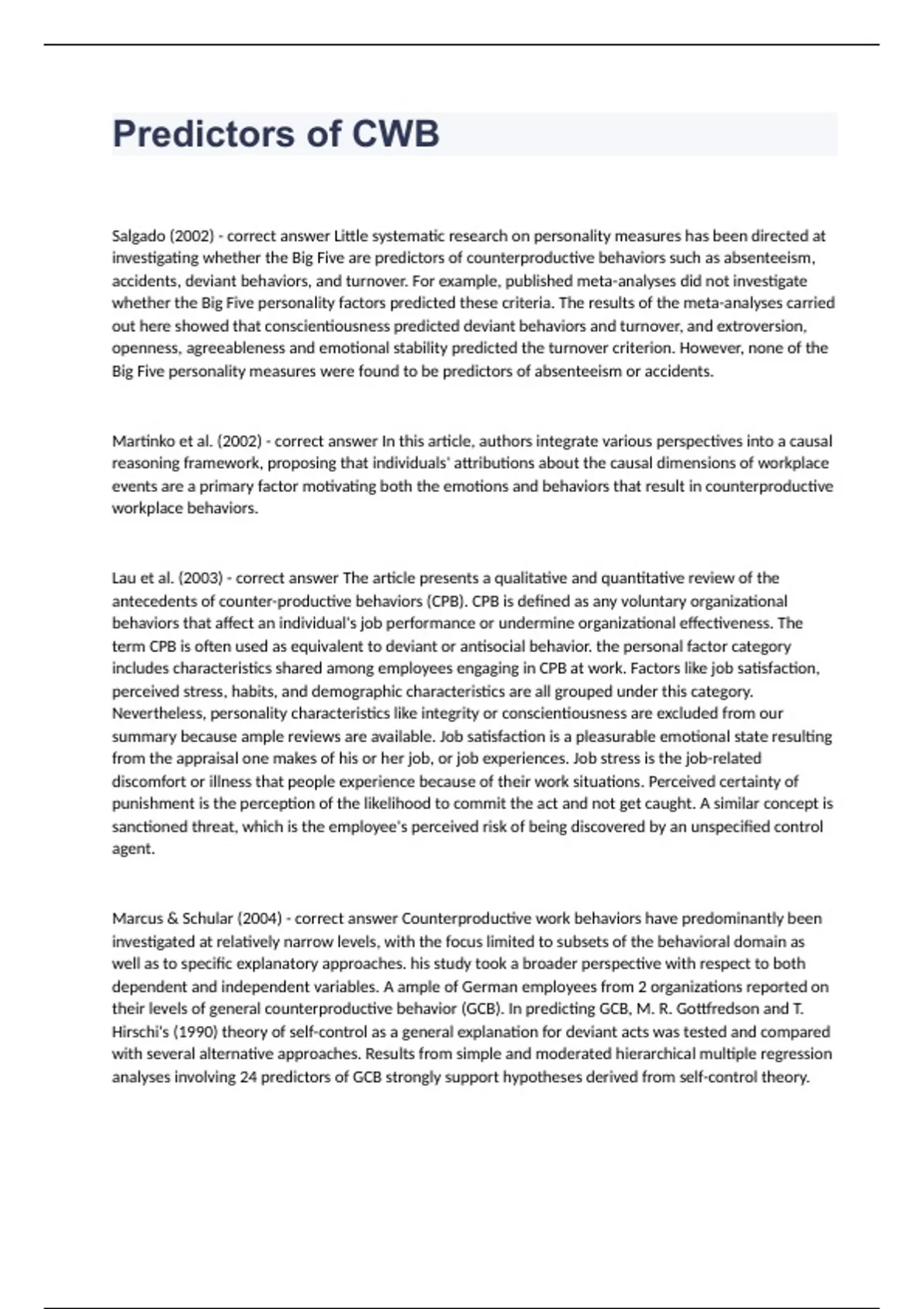 Predictors of CWBSalgado (2002) - correct answer Little systematic research on personality measures has been directed at investigating whether the Big Five are predictors of counterproductive behaviors such as absenteeism, accidents, deviant behaviors, and turnover. For example, published meta-analyses did not investigate whether the Big Five personality factors predicted these criteria. The results of the meta-analyses carried out here showed that conscientiousness predicted deviant behaviors and turnover, and extroversion, openness, agreeableness and emotional stability predicted the turnover criterion. However, none of the Big Five personality measures were found to be predictors of absenteeism or accidents. Martinko et al. (2002) - correct answer In this article, authors integrate various perspectives into a causal reasoning framework, proposing that individuals' attributions about the causal dimensions of workplace events are a primary factor motivating both the emotions and behaviors that result in counterproductive workplace behaviors. Lau et al. (2003) - correct answer The article presents a qualitative and quantitative review of the antecedents of counter-productive behaviors (CPB). CPB is defined as any voluntary organizational behaviors that affect an individual's job performance or undermine organizational effectiveness. The term CPB is often used as equivalent to deviant or antisocial behavior. the personal factor category includes characteristics shared among employees engaging in CPB at work. Factors like job satisfaction, perceived stress, habits, and demographic characteristics are all grouped under this category. Nevertheless, personality characteristics like integrity or conscientiousness are excluded from our summary because ample reviews are available. Job satisfaction is a pleasurable emotional state resulting from the appraisal one makes of his or her job, or job experiences. Job stress is the job-related discomfort or illness that people experience because of their work situations. Perceived certainty of punishment is the perception of the likelihood to commit the act and not get caught. A similar concept is sanctioned threat, which is the employee's perceived risk of being discovered by an unspecified control agent. Marcus & Schular (2004) - correct answer Counterproductive work behaviors have predominantly been investigated at relatively narrow levels, with the focus limited to subsets of the behavioral domain as well as to specific explanatory approaches. his study took a broader perspective with respect to both dependent and independent variables. A ample of German employees from 2 organizations reported on their levels of general counterproductive behavior (GCB). In predicting GCB, M. R. Gottfredson and T. Hirschi's (1990) theory of self-control as a general explanation for deviant acts was tested and compared with several alternative approaches. Results from simple and moderated hierarchical multiple regression analyses involving 24 predictors of GCB strongly support hypotheses derived from self-control theory. Little support is found for any effects on individual differences in GCB beyond the direct and conditional impact of internal control. Cohen-Charas & Meuller (2007) - correct answer The authors examined how the interaction between perceived unfairness and episodic envy predicts interpersonal counterproductive work behaviors toward the envied other. In 2 studies using different samples and methods to elicit envy, predictions were compared based on the social exchange and attribution models of fairness. The results support the social exchange model of fairness, showing that higher levels of envy and perceived unfairness result in higher levels of interpersonal counterproductive work behavior (Study 1), especially among high self-esteem individuals (Study 2). Dwayne & Dion (2010) - correct answer This study tested the direct effects of three dimensions of organizational justice - distributive justice, procedural justice, and interactional justice - on contextual performance, counterproductive work behaviors, and task performance. The study also examined the moderating effects of an ability measure of emotional intelligence (EI) on the justice-performance relationship. Based on the data from 211 employees across nine organizations from the private and public sectors in a developing country in the Caribbean, the results revealed that all three justice dimensions had significant effects on task performance, contextual performance, and counterproductive work behaviors in the expected direction. Composite EI and its four subdimensions (appraisal and expression of emotion in the self, appraisal and recognition of emotion in others, regulation of emotion, and use of emotion) moderated the relationship between procedural justice and contextual performance, but failed to moderate other justice-performance relationships. Bowling & Eschleman (2010 - correct answer This study studied CWBs as a response to ineffective coping with work stressors. Authors examined whether the relationship between work stressors and CWBs was moderated by employee's personality. They found that high Conscientiousness and low Negative Affectivity employees demonstrated lower CWBs. Bolton et al. (2010) - correct answer Counterproductive work behaviors (CWBs) negatively affect the well-being of an organization and/or the performance of its employees. This study compared the predictive validity of the Big Five traits with respect to the one-, two-, and five-dimensional approaches for measuring CWBs. Survey results from employees (N = 233) confirmed previous relationships with agreeableness predicting a composite measure of CWBs and interpersonally-directed (ID) behaviors, and conscientiousness predicting a composite measure of CWBs and organizationally-directed (OD) behaviors. However, conscientiousness only predicted the OD behaviors of sabotage and theft. Extraversion predicted theft while