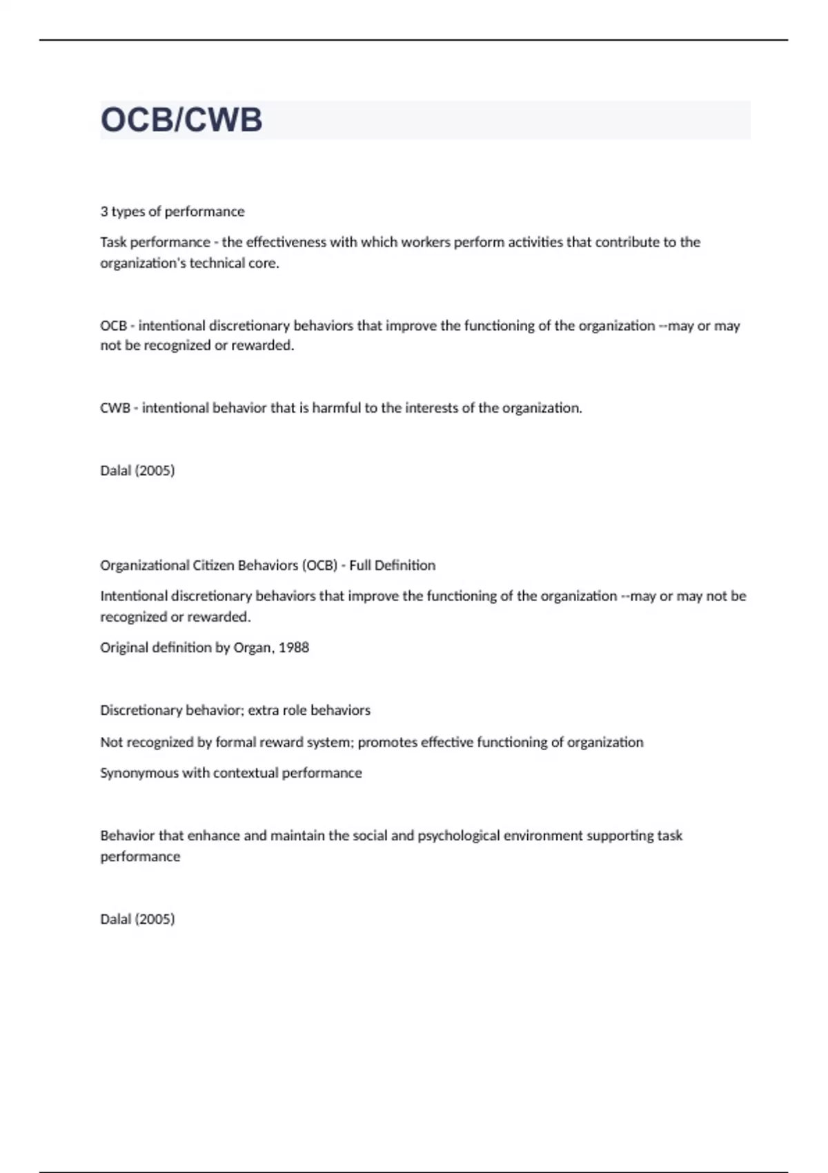 OCB/CWB 3 types of performance Task performance - the effectiveness with which workers perform activities that contribute to the organization's technical core. OCB - intentional discretionary behaviors that improve the functioning of the organization --may or may not be recognized or rewarded. CWB - intentional behavior that is harmful to the interests of the organization. Dalal (2005) Organizational Citizen Behaviors (OCB) - Full Definition Intentional discretionary behaviors that improve the functioning of the organization --may or may not be recognized or rewarded. Original definition by Organ, 1988 Discretionary behavior; extra role behaviors Not recognized by formal reward system; promotes effective functioning of organization Synonymous with contextual performance Behavior that enhance and maintain the social and psychological environment supporting task performance Dalal (2005) CWB Defintion CWB - intentional behavior that is harmful to the interests of the organization. (Dalal, 2005) Incivility: low-intensity antisocial/deviant behavior with ambiguous intent to harm the target; in voilation of workplace norms or mutual respect psychological aggression: when the instigator aims to injure the target. Cortina et al (2011) OCB/CWB - Components/Dimensions Two components: Interpersonal, Organizational OCB-interpersonal (OCB-I) which is directed at coworker(s) e.g. helping behaviors, Altruism, Cooperation, Taking personal interest in other employees OCB-Organizational (OCB-O) which are actions/behaviors directed at the organizational level. e.g. conscientiousness, generalized compliance and obedience, attendance, following rules, conserving organizational resources, not complaining at work Example---Compliance: Internalizing and accepting the organization's rules, regulations, procedures May also be reasonable to think of overall/global OCB/CWF factors. Dimensions not predictive Dala (2005) Counter Productive Work Behavior - Model Sackett & DeVore (2002) - Hierarchical Model of Deviance Counterproductive Behaviors - Type (2) - Interpersonal e.g harassment, gossip, verbal abuse, fighting - Organizational - Types (2) - Property e.g. theft, property damage, sabotage - Production e.g. absence, tardiness, long breaks, substance abuse, sloppy work OCB - CWB Opposites? Conceptually opposite. No support for continuum theory. Different antecedent (strength) Dalal (2005) Theories, Mechanisms, Antecedents Social Exchange Theory Norm of Reciprocity Justice/Perceptions of Fairness ----Psychological Contracts ----Retaliation (especially CWB) Personality - Consciousness, PA/NA