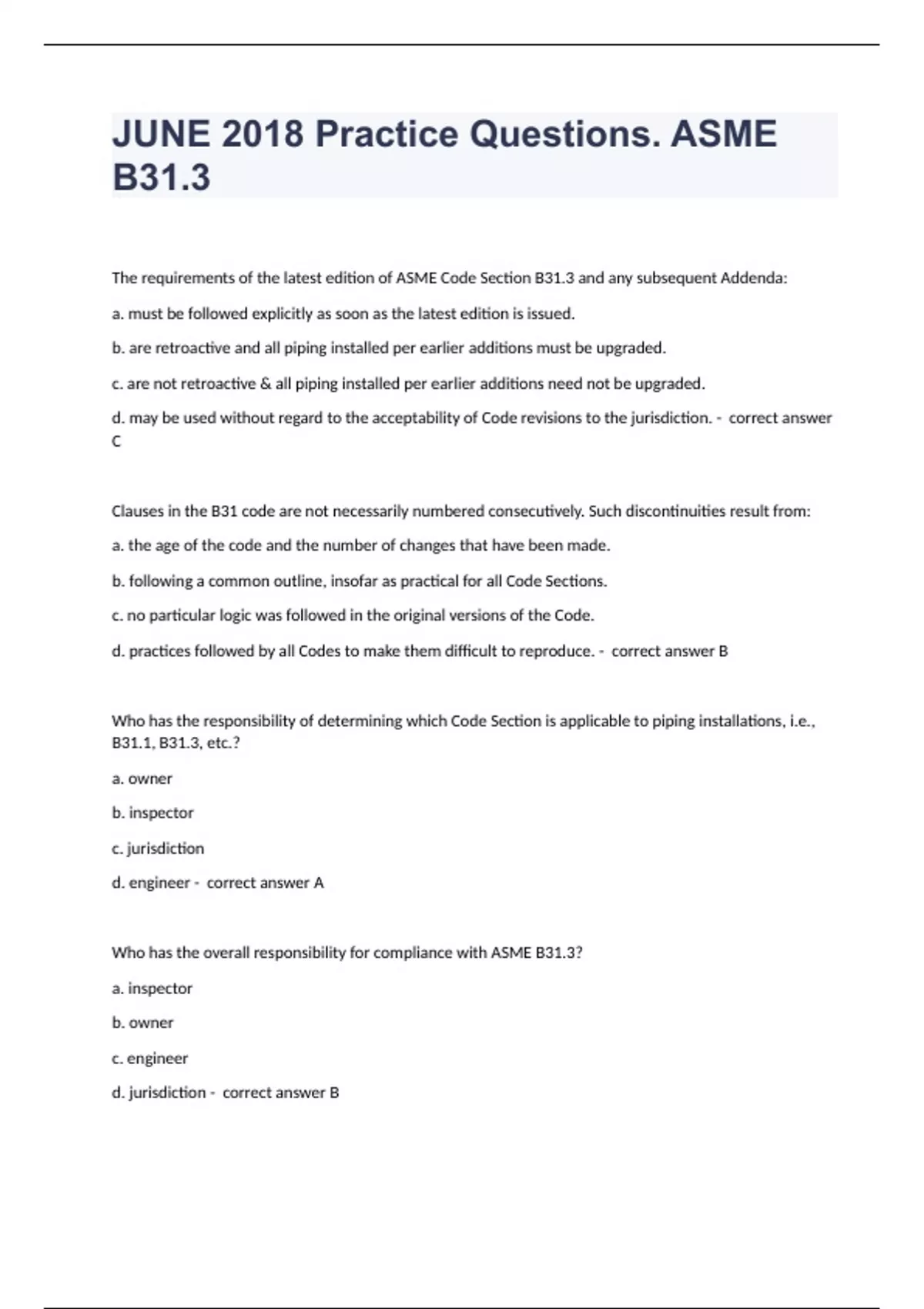 JUNE 2018 Practice Questions. ASME B31.3 The requirements of the latest edition of ASME Code Section B31.3 and any subsequent Addenda: a. must be followed explicitly as soon as the latest edition is issued. b. are retroactive and all piping installed per earlier additions must be upgraded. c. are not retroactive & all piping installed per earlier additions need not be upgraded. d. may be used without regard to the acceptability of Code revisions to the jurisdiction. - correct answer C Clauses in the B31 code are not necessarily numbered consecutively. Such discontinuities result from: a. the age of the code and the number of changes that have been made. b. following a common outline, insofar as practical for all Code Sections. c. no particular logic was followed in the original versions of the Code. d. practices followed by all Codes to make them difficult to reproduce. - correct answer B Who has the responsibility of determining which Code Section is applicable to piping installations, i.e., B31.1, B31.3, etc.? a. owner b. inspector c. jurisdiction d. engineer - correct answer A Who has the overall responsibility for compliance with ASME B31.3? a. inspector b. owner c. engineer d. jurisdiction - correct answer B The intent of ASME B31.3 is to set forth engineering requirements deemed necessary for ________ __________ and ______________ of piping installations. a. structural design, fabrication b. safe design, construction c. adequate fabrication, execution d. permanent existence, longevity - correct answer B ASME Code is not intended to apply to piping: a. in the chemical industry. b. that has been placed in service. c. in the agronomy industry. d. in the space industry. - correct answer B Compatibility of materials with the service and hazards from instability of contained fluids: a. is covered extensively by ASME B31.3. b. are not within the scope of ASME B31.3. c. is addressed on a limited basis by ASME B31.3. d. is the main scope of ASME B31.3. - correct answer B ASME B31.3 applies to piping for all fluids except for which of the below? a. tubes of fired heaters, plumbing, and storm sewers b. raw, intermediate, and finished chemicals c. petroleum products, fluidized solids and refrigerants d. gas, steam, air, and water - correct answer A A preplaced filler metal which is completely fused into the root of a welded joint and becomes part of the weld is called: a. a depleted appendage.
