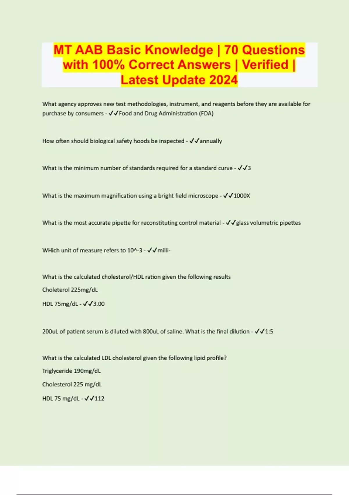 What agency approves new test methodologies, instrument, and reagents before they are available for purchase by consumers - Food and Drug Administration (FDA) How often should biological safety hoods be inspected - annually What is the minimum number of standards required for a standard curve - 3 What is the maximum magnification using a bright field microscope - 1000X What is the most accurate pipette for reconstituting control material - glass volumetric pipettes WHich unit of measure refers to 10^-3 - milliWhat is the calculated cholesterol/HDL ration given the following results Choleterol 225mg/dL HDL 75mg/dL - 3.00 200uL of patient serum is diluted with 800uL of saline. What is the final dilution - 1:5