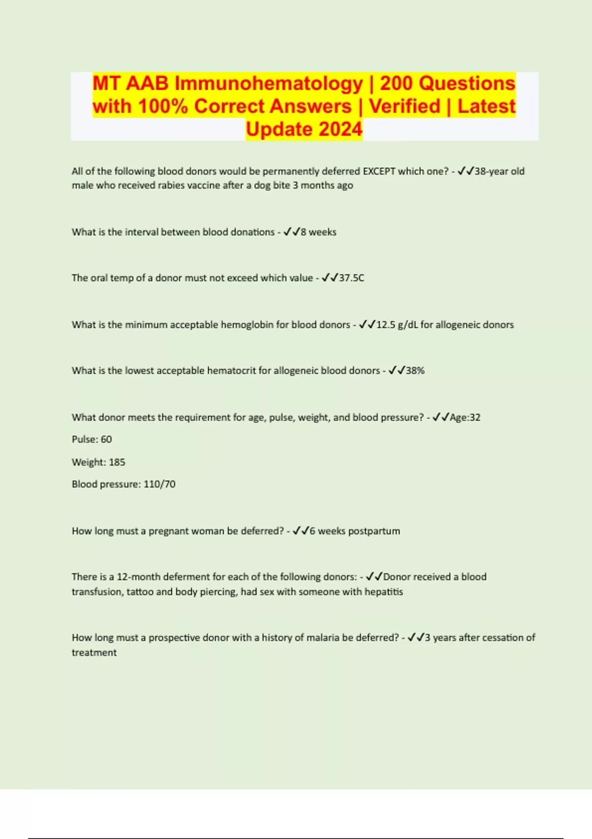 All of the following blood donors would be permanently deferred EXCEPT which one? - 38-year old male who received rabies vaccine after a dog bite 3 months ago What is the interval between blood donations - 8 weeks The oral temp of a donor must not exceed which value - 37.5C What is the minimum acceptable hemoglobin for blood donors - 12.5 g/dL for allogeneic donors What is the lowest acceptable hematocrit for allogeneic blood donors - 38% What donor meets the requirement for age, pulse, weight, and blood pressure? - Age:32 Pulse: 60 Weight: 185 Blood pressure: 110/70 How long must a pregnant woman be deferred? - 6 weeks postpartum There is a 12-month deferment for each of the following donors: - Donor received a blood transfusion, tattoo and body piercing, had sex with someone with hepatitis