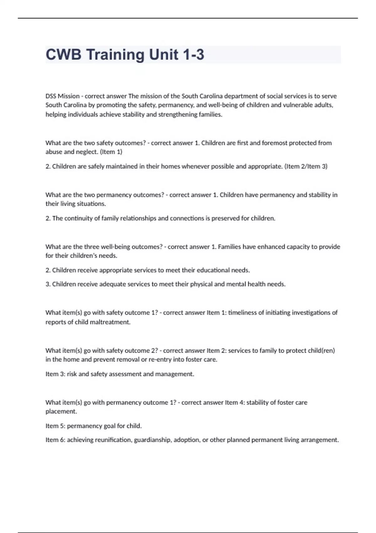 CWB Training Unit 1-3DSS Mission - correct answer The mission of the South Carolina department of social services is to serve South Carolina by promoting the safety, permanency, and well-being of children and vulnerable adults, helping individuals achieve stability and strengthening families. What are the two safety outcomes? - correct answer 1. Children are first and foremost protected from abuse and neglect. (Item 1) 2. Children are safely maintained in their homes whenever possible and appropriate. (Item 2/Item 3) What are the two permanency outcomes? - correct answer 1. Children have permanency and stability in their living situations. 2. The continuity of family relationships and connections is preserved for children. What are the three well-being outcomes? - correct answer 1. Families have enhanced capacity to provide for their children's needs. 2. Children receive appropriate services to meet their educational needs. 3. Children receive adequate services to meet their physical and mental health needs. What item(s) go with safety outcome 1? - correct answer Item 1: timeliness of initiating investigations of reports of child maltreatment. What item(s) go with safety outcome 2? - correct answer Item 2: services to family to protect child(ren) in the home and prevent removal or re-entry into foster care. Item 3: risk and safety assessment and management. What item(s) go with permanency outcome 1? - correct answer Item 4: stability of foster care placement. Item 5: permanency goal for child. Item 6: achieving reunification, guardianship, adoption, or other planned permanent living arrangement. What item(s) go with permanency outcome 2? - correct answer Item 7: placement with siblings. Item 8: visiting with parents and siblings in foster care. Item 9: preserving connections. Item 10: relative placement. Item 11: relationship of a child in care with parents. What item(s) go with well-being outcome 1? - correct answer Item 12: needs and services of child, parents, and foster parents. Item 13: child and family involvement in case planning. Item 14: caseworker visits with child. Item 15: caseworker visits with parents. What item(s) go with well-being outcome 2? - correct answer Item 16: educational needs of the child. What item(s) go with well-being outcome 3? - correct answer Item 17: physical health of the child. Item 18: mental/behavioral health of the child. Guiding Principles - correct answer To respect the humanity and dignity of each person for whom the agency delivers quality services. A. R. E. - correct answer Appearance Relationships Environment -refers to how we convey professionalism Oz Principle - correct answer Accountability: see it, own it, solve it, do it. Child Welfare Values - correct answer Self-Determination Nonmaleficence Beneficence Justice Fidelity Veracity Protection of Children Preservation of Families Respect for Families Competence Dignity and Worth of the Person Individualized Intervention Loyalty Diligence Confidentiality Child Welfare Imperatives - correct answer 1. At all times, the child's immediate and enduring safety and well-being must take precedence over the comfort of adults. 2. Child safety will always improve when the adults who care for them work together and support each other. 3. Children do not "disrupt". Adults fail to provide the adequate level of response to meet the child(ren)'s need. 4. Shared understanding and meaning always propel actions and drive results. 5. Children must never be left to protect or provide for themselves or others; that is the role of all responsible adults. Primary Culture - correct answer cannot change i.e. sex, age, mental/physical abilities and characteristics, sexual orientation, ethnic heritage, race. Secondary Culture - correct answer can change i.e. family status, work style, education, geographic location, military experience, work experience, income, religion, first language, organizational role and level, communication style. Verbal Communication - correct answer language Nonverbal Communication - correct answer body language, gestures, actions. Paraverbal Communication - correct answer tone, cadence, rate of speech. A.G.E. - correct answer Tool for building relationships. Acceptance: involves respect and validation, separating the person from their behaviors. Genuineness: involves being yourself, using humor and spontaneity, and being truthful. Empathy: an attempt to experience another's worldview and communicate an awareness of that experience with compassion. Interview - correct answer conversation b/w two or more people gathering information. conversation with a purpose. E.A.R.S. - correct answer Helps gather information. Elicit: the first question asked about a particular topic. Open-ended. Amplify: follow-up questions. Bulk of information/most critical information found here. Reflect: prior/during/after maltreatment. Helps interviewee process their experiences and understand the situation. Start over: ask another elicit question. What areas should you inquire about when gathering information through E.A.R.S.? - correct answer 1. Maltreatment 2. Nature (circumstances that led to maltreatment) 3. Child Functioning 4. Adult Functioning