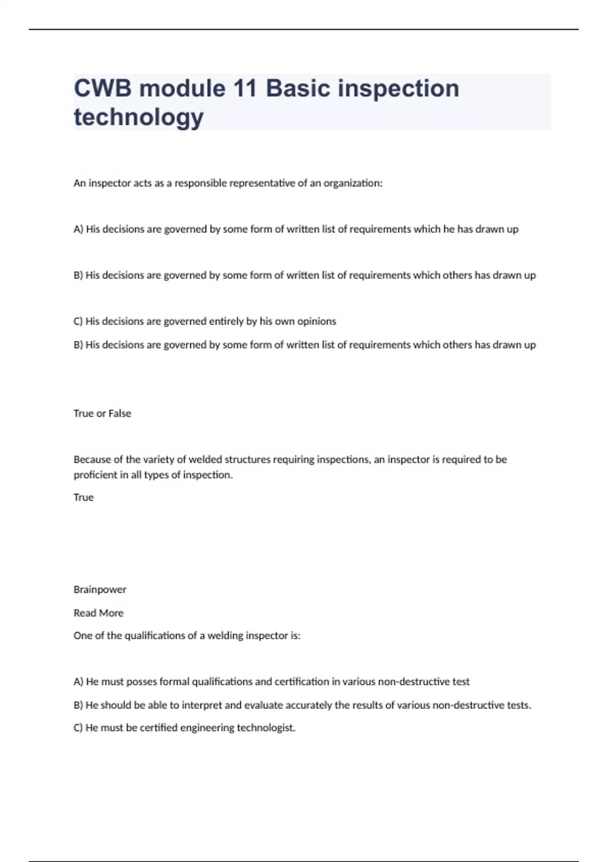 CWB module 11 Basic inspection technologyAn inspector acts as a responsible representative of an organization: A) His decisions are governed by some form of written list of requirements which he has drawn up B) His decisions are governed by some form of written list of requirements which others has drawn up C) His decisions are governed entirely by his own opinions B) His decisions are governed by some form of written list of requirements which others has drawn up True or False Because of the variety of welded structures requiring inspections, an inspector is required to be proficient in all types of inspection. True Brainpower Read More One of the qualifications of a welding inspector is: A) He must posses formal qualifications and certification in various non-destructive test B) He should be able to interpret and evaluate accurately the results of various non-destructive tests. C) He must be certified engineering technologist. B) He should be able to interpret and evaluate accurately the results of various non-destructive tests. Where deviations from the drawings are warranted, the inspector A) Authorizes approval of such deviations B) May be called on to obtain official approval. C) must reject the work without any further consideration B) May be called on to obtain official approval. True or False Procedures are not absolutely necessary to control the welding operations and quality of the structure False At what stage should welding inspection begin? Prior to actual fabrication operations. Radiography is the most commonly used non-destructive method for the detection of ______________ in welds A) Underbead non-fusion B) Surface discontinuities C) Volumetric discontinuities D) Crack-like discontinuities C) Volumetric discontinuities