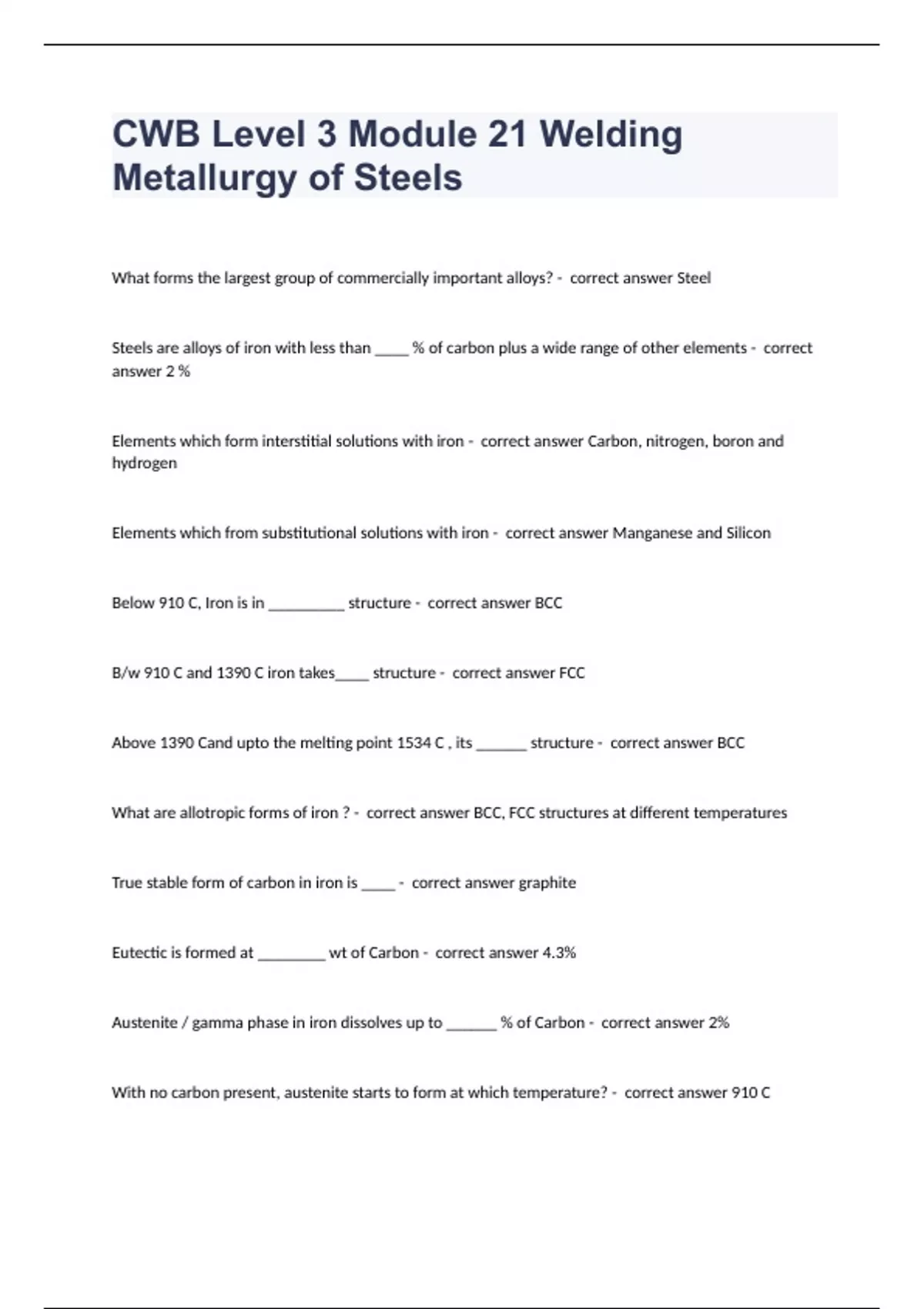 CWB Level 3 Module 21 Welding Metallurgy of Steels fully solved graded A+ 2023/2024