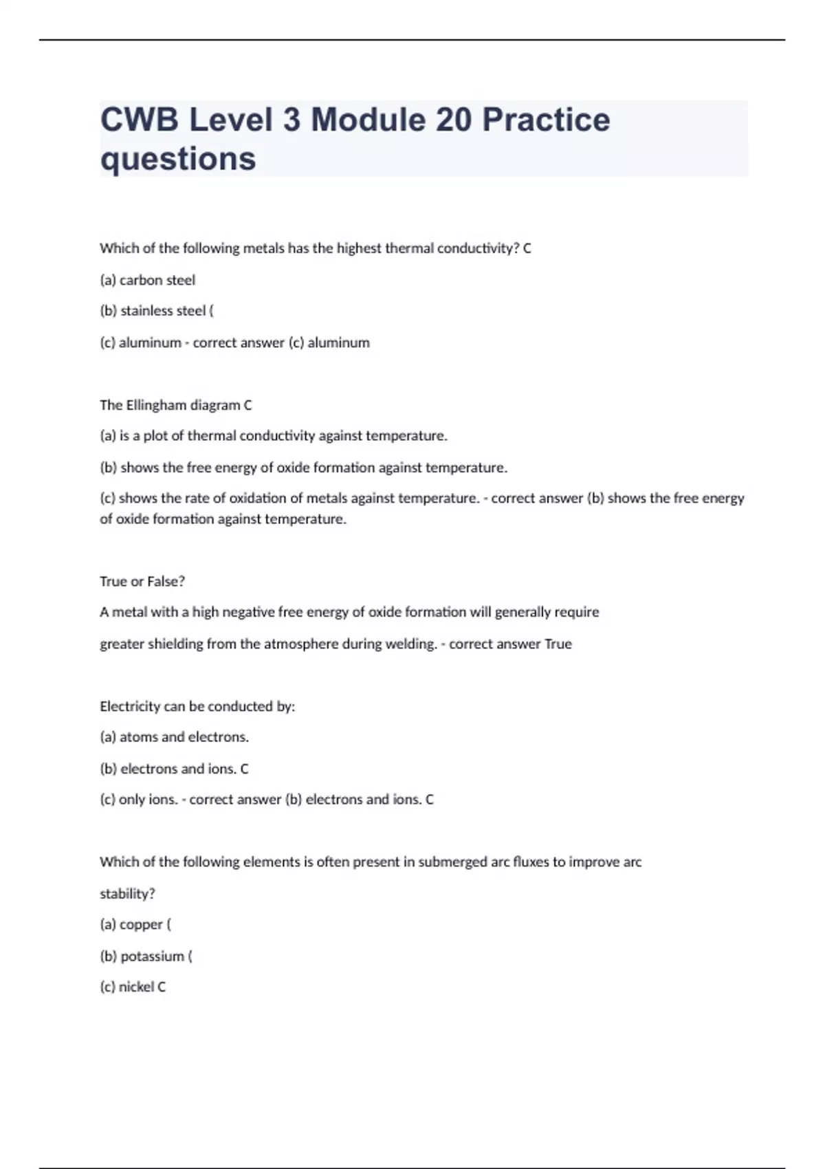 CWB Level 3 Module 20 Practice questions Which of the following metals has the highest thermal conductivity? C (a) carbon steel (b) stainless steel ( (c) aluminum - correct answer (c) aluminum The Ellingham diagram C (a) is a plot of thermal conductivity against temperature. (b) shows the free energy of oxide formation against temperature. (c) shows the rate of oxidation of metals against temperature. - correct answer (b) shows the free energy of oxide formation against temperature. True or False? A metal with a high negative free energy of oxide formation will generally require greater shielding from the atmosphere during welding. - correct answer True Electricity can be conducted by: (a) atoms and electrons. (b) electrons and ions. C (c) only ions. - correct answer (b) electrons and ions. C Which of the following elements is often present in submerged arc fluxes to improve arc stability? (a) copper ( (b) potassium ( (c) nickel C (d) tungsten - correct answer (b) potassium ( Thoria is added to tungsten electrodes for what purpose? - correct answer To increase thermionic emission by lowering the work function. True or False? All pure metals have the same crystal structure. - correct answer False. Metals generally have one of three basic structures. Which crystal structure(s) is (are) composed of close-packed planes? - correct answer FCC and HCP The real strength of metals is lower than the theoretical value because: (a) real crystals always fracture along specific crystal planes. (b) grain boundary sliding occurs. (c) the presence of dislocations facilitates slip. - correct answer (c) the presence of dislocations facilitates slip. Multiplication and subsequent congestion of moving dislocations causes: (a) elastic extension. (b) work or strain hardening. (c) a drop in the yield stress. - correct answer (b) work or strain hardening. Which of the following elements are most likely to form interstitial solid solutions? (a) copper (b) nickel (c) carbon - correct answer (c) carbon If FCC iron has a denser structure than BCC iron, why does it have a higher solubility for carbon? - correct answer The preferred site for carbon in BCC iron is smaller than that in FCC iron. If two metals have complete mutual solid solubility how many phases are formed in the solid— one ortwo? - correct answer One How many phases are there in a eutectic—one or two? - correct answer Two Without referring to the text, draw the phase diagram for a eutectic system with limited mutual solid solubility of the two components. - correct answer Refer to Figure 6.6. Using the portion of the iron—carbon phase diagram in Figure 6.10, use the lever rule to determine the percentage of ferrite and eutectoid pea rlite present in a slowly cooled 0.2% carbon steel. - correct answer About 25% pearlite and 75% ferrite. Here the tie line begins at 0.0%C (a ferrite) and ends at 0.08%C (pearlite). The fulcrum for the lever rule is at 0.2%C % pearlite = (0.2%C — 0.0%C)I(0.8%C — 0.0%C) x 100% % pearlite = (0.2/0.8) x 100% % pearlite = 25% Which of the following metals has the highest work hardening coefficient? (a) 70/30 brass (b) aluminum (c) copper (d) low carbon steel - correct answer a True or False? Recrystallization always involves the formation of a new phase. - correct answer False To get recovery and recrystallization the metal must have been previously