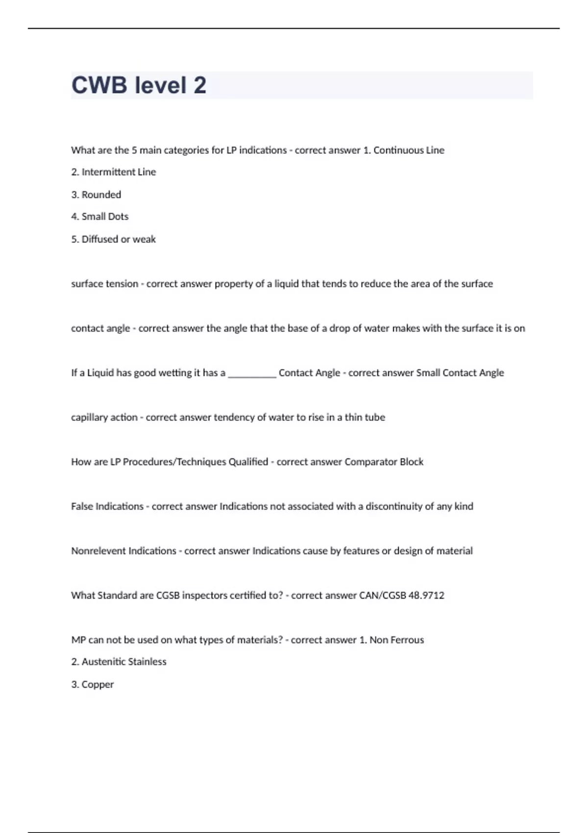 CWB level 2What are the 5 main categories for LP indications - correct answer 1. Continuous Line 2. Intermittent Line 3. Rounded 4. Small Dots 5. Diffused or weak surface tension - correct answer property of a liquid that tends to reduce the area of the surface contact angle - correct answer the angle that the base of a drop of water makes with the surface it is on If a Liquid has good wetting it has a _________ Contact Angle - correct answer Small Contact Angle capillary action - correct answer tendency of water to rise in a thin tube How are LP Procedures/Techniques Qualified - correct answer Comparator Block False Indications - correct answer Indications not associated with a discontinuity of any kind Nonrelevent Indications - correct answer Indications cause by features or design of material What Standard are CGSB inspectors certified to? - correct answer CAN/CGSB 48.9712 MP can not be used on what types of materials? - correct answer 1. Non Ferrous 2. Austenitic Stainless 3. Copper 4. Aluminum flux leakage field - correct answer a path created between 2 new polls as a result of an indication Lines of force must run ________ to the crack, for the crack to appear. - correct answer perpendicular induced magnetism - correct answer the influence of a external magnetic field on a piece of iron, which makes the iron a temporary magnet Flux density - correct answer A measure of the density of the field lines around a magnet Permeability - correct answer the ability for a material to hold its magnetism. Magnetic saturation - correct answer When the flux reaches a maximum and the material can no longer be further magnetized. Magnetic Retentivity - correct answer the ability of a material to stay magnetized How do inspectors remove a materials retained flux? - correct answer apply field in opposite direction Coercive Force - correct answer the strength of the reverse field necessary to bring the induced flux to zero. what range should the applied filed be applied to avoid saturation of a material? - correct answer 30 to 70% electric current produces what kind of magnetic field? - correct answer circular the lines of force are _______ the strength of the applied current? a. proportional b. 2x bigger c. 2x smaller - correct answer a. proportional Adding a coil does what to the magnetic field? - correct answer increase. it adds to the strength of the others Ampere-turns - correct answer the relative strength of a field from a coil 2 types of magnetization in MP inspection? - correct answer 1. longitudinal, and circular. 2 methods of MP inspection? - correct answer 1. direct magnetization - current passes through the part 2. indirect magnetization - either a permanent or electromagnet is placed directly on the part or the part is placed in and electromagnet. how are arc strikes avoided when using Prods for MP inspection? - correct answer current is not applied until both prods are on the part. current applied during MT inspection using prods is calculated by _______ amps for every mm - correct answer 4 amps per mm or 100 amps per inch (90 to 125 amps for each 25 mm or 1 in) typical amp output from a yoke is? - correct answer 5 to 10 amps during MT inspection an AC will magnetize the ______ of the part. - correct answer surface (skin effect) Direct current applied during MT Inspection has the ability to penetrate how far into the material? - correct answer 2- 3 mm During MT inspection which methods is more sensitive? a. wet