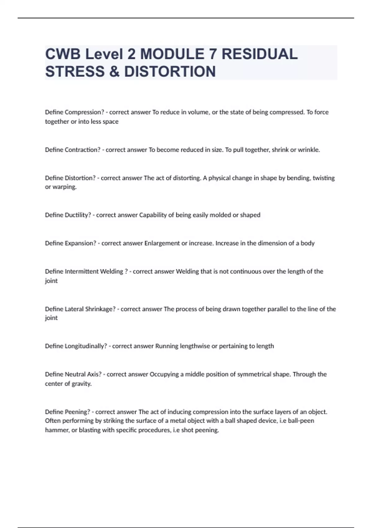 CWB Level 2 MODULE 7 RESIDUAL STRESS & DISTORTIONDefine Compression? - correct answer To reduce in volume, or the state of being compressed. To force together or into less space Define Contraction? - correct answer To become reduced in size. To pull together, shrink or wrinkle. Define Distortion? - correct answer The act of distorting. A physical change in shape by bending, twisting or warping. Define Ductility? - correct answer Capability of being easily molded or shaped Define Expansion? - correct answer Enlargement or increase. Increase in the dimension of a body Define Intermittent Welding ? - correct answer Welding that is not continuous over the length of the joint Define Lateral Shrinkage? - correct answer The process of being drawn together parallel to the line of the joint Define Longitudinally? - correct answer Running lengthwise or pertaining to length Define Neutral Axis? - correct answer Occupying a middle position of symmetrical shape. Through the center of gravity. Define Peening? - correct answer The act of inducing compression into the surface layers of an object. Often performing by striking the surface of a metal object with a ball shaped device, i.e ball-peen hammer, or blasting with specific procedures, i.e shot peening. Define Periphery? - correct answer The outer part of an object or area Define Residual Stresses? - correct answer Stresses remaining after a process has been completed. Stress present in a material that is free of external forces or thermal gradients. Define Permanent Deformation ? - correct answer Shape change that is not reversible by the removal of the forces (plastic deformation) that caused it. Define Restrain? - correct answer To prevent or limit movement Define Restraint? - correct answer The act of holding back Define Shrinkage Force? - correct answer An internal force exerted on a component due to uneven dimensional change during heating and cooling Define Strain? - correct answer A shape change produced by stress Define Stress? - correct answer An internal force or system of forces that tend to strain or deform an object or body. Force per unit area. Define Symmetrical? - correct answer Exactly uniform in shape about a dividing line or about a center or axis. Define Transverse? - correct answer Situated or lying across Define Tensile Stress? - correct answer A stress that tends to cause elongation or extension Define Upset? - correct answer To make shorter or thicker EXAM QUESTION Section 1-4