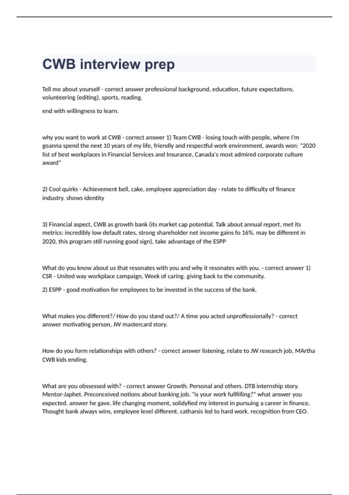 CWB interview prepTell me about yourself - correct answer professional background, education, future expectations, volunteering (editing), sports, reading. end with willingness to learn. why you want to work at CWB - correct answer 1) Team CWB - losing touch with people, where I’m goanna spend the next 10 years of my life, friendly and respectful work environment, awards won: "2020 list of best workplaces in Financial Services and Insurance, Canada's most admired corporate culture award" 2) Cool quirks - Achievement bell, cake, employee appreciation day - relate to difficulty of finance industry. shows identity 3) Financial aspect, CWB as growth bank (its market cap potential. Talk about annual report, met its metrics: incredibly low default rates, strong shareholder net income gains fo 16%. may be different in 2020, this program still running good sign), take advantage of the ESPP What do you know about us that resonates with you and why it resonates with you. - correct answer 1) CSR - United way workplace campaign, Week of caring. giving back to the community. 2) ESPP - good motivation for employees to be invested in the success of the bank. What makes you different?/ How do you stand out?/ A time you acted unproffessionally? - correct answer motivating person, JW mastercard story. How do you form relationships with others? - correct answer listening, relate to JW research job, MArtha CWB kids ending. What are you obssessed with? - correct answer Growth. Personal and others. DTB internship story. Mentor-Japhet. Preconceived notions about banking job. "is your work fullfilling?" what answer you expected. answer he gave. life changing moment, solidyfied my interest in pursuing a career in finance. Thought bank always wins, employee level different. catharsis led to hard work. recognition from CEO. conclude, personal and professional growth, read fitness. How do you define success? - correct answer Depends on context, In a professional context, success to me has a number of factors. The first criteria is a satisfied customer, whether the customer is my boss or a client. I want to not only have met the specifications of the project, but also to have surpassed expectations by personally finding unique ways to create value. Furthermore, I need to feel that the final project represents my best work and that of my team. For me, success means knowing that the work is done in a very ethical manner, having some fun along the way, and most important of all i met or surpassed the customers expectations. In a personal context, celebrate small victories. no big wins everyday, link to mental happiness. talk about the journey to big wins. Dealing with losses amplifies if you dont celebrate your small successes. example of working out, easy tests. What are some of your strengths and weaknesses? - correct answer 1) loyalty - working in a team setting. playing sports, wathcing shows. If org gives me the chance, reward them with quality work and loyalty. 2) creativity - university group projects, involvement in volunteer clubs, creating and editing social media posts and magazines. cookbook preject - target and results. 3) Willingness to learn - not afraid to admit when I dont know something, I ask questions and have a very curious mind. Talk about time in DTB, go from Dept to Dept, talking to individuals about their job. Weakness- hard time letting go of a project, biggest critic is me, case in point - sleepless nights cos of this interview. setting deadlines to improve. a time you made a mistake, how did you handle it? - correct answer DTB, doing the leg work of data entry, slow day..Paper journals vs digital (kenya), printing issues. a slip of mind, Entered the data in the wrong columns. Realized later after submission. told supervisor about the error, and he was really chill about it and gave me the chance to correct it. Felt bad cos impact on persons ability to get credit, since then i pay closest attention to event he simplest of excel tasks. How do you handle a challenge/pressure? - correct answer 3rd year, 1st sem. 5 courses, hardest course fin 413, two part time jobs. describe a typical day. on top of that, i had commitments to my volunteering