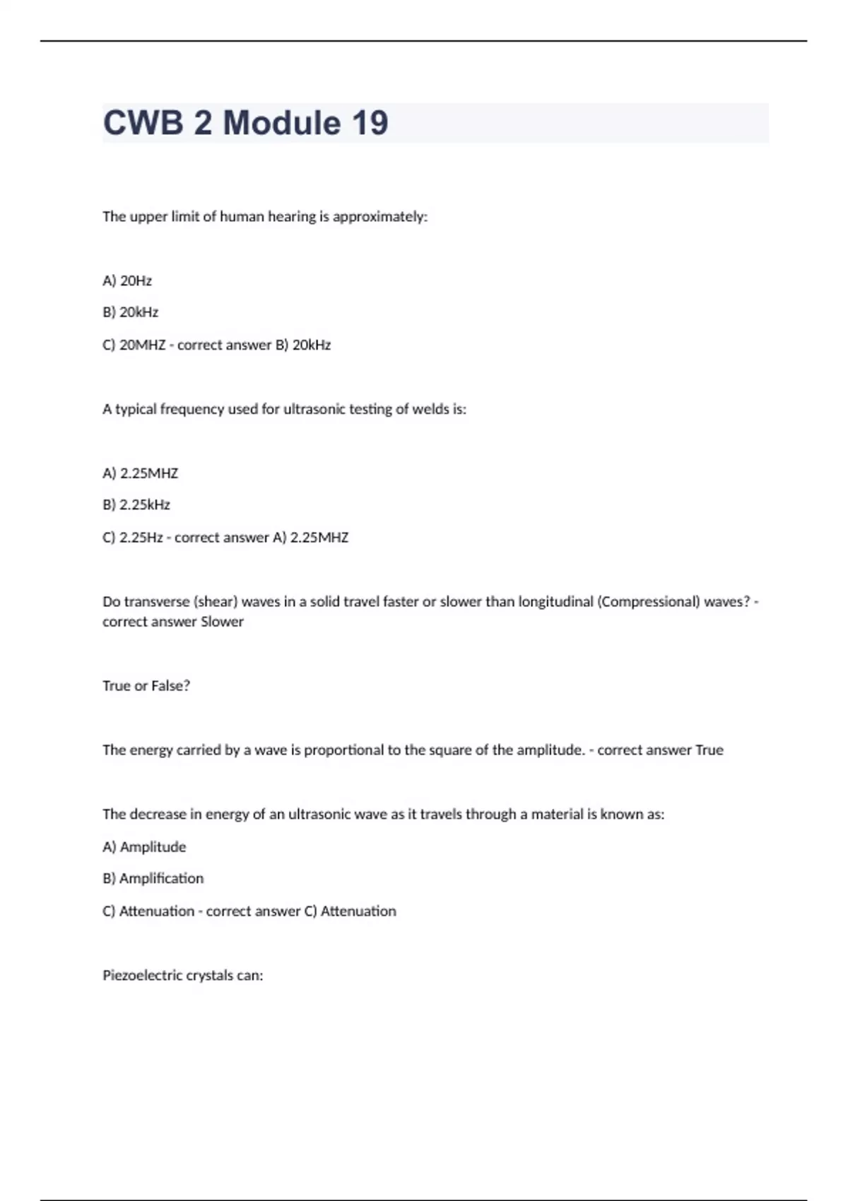 CWB 2 Module 19 The upper limit of human hearing is approximately: A) 20Hz B) 20kHz C) 20MHZ - correct answer B) 20kHz A typical frequency used for ultrasonic testing of welds is: A) 2.25MHZ B) 2.25kHz C) 2.25Hz - correct answer A) 2.25MHZ Do transverse (shear) waves in a solid travel faster or slower than longitudinal (Compressional) waves? - correct answer Slower True or False? The energy carried by a wave is proportional to the square of the amplitude. - correct answer True The decrease in energy of an ultrasonic wave as it travels through a material is known as: A) Amplitude B) Amplification C) Attenuation - correct answer C) Attenuation Piezoelectric crystals can: A) Change mechanical pulses into electrical pulses B) Change electrical pulses into mechanical pulses C) Both A and B - correct answer C) Both A and B The natural frequency of a given piezoelectric transducer is determined by: A) The amplitude of the voltage applied B) The transducer thickness C) Neither of the above. The frequency is set by the material being inspected and cannot be changed. - correct answer B) The transducer thickness Name one piezoelectric material: - correct answer Quartz and lead metaniobate In conventional ultrasonics the wave is injected into the specimen as a: A) Continuous wave that the natural frequency of the transducer. B) Short pulse containing several oscillations at the natural frequency - correct answer B) Short pulse containing several oscillations at the natural frequency Why is good acoustic contact between the transducer and the test specimen needed? - correct answer Ultrasonic waves of the frequency used in inspection do not travel far in air, so good coupling between the transducer and the specimen is needed True or false? A couplant is only needed if the surface is rough - correct answer False In A-scan display the vertical displacement of the trace is calibrated to represent: A) The amplitude of the reflected wave B) The size of the reflector C) Distance - correct answer A) The amplitude of the reflected wave In A-scan display the horizontal displacement of the trace is calibrated to represent: A) The amplitude of the reflected wave B) The size of the reflector C) Distance - correct answer C) Distance In what unit is the gain control (or attenuator) marked? - correct answer dB (decibels) Which type of display gives a cross-sectional view showing the length and depth of discontinuities? - correct answer B-Scan Give an example of a system where the entire specimen is immersed in water, which acts as the couplant. - correct answer On-line examination of plate defects such as laminations in a steel mill True or False? Acoustic emission relies on detecting very small amounts of mechanical energy released from such things as growing cracks or structural discontinuities under load. - correct answer True True or False? The plate and weld surface must always be ground smooth prior to ultrasonic examination. - correct answer False Why should most ultrasonic examinations of welds begin with a search of the place with a normal probe? - correct answer To identify plate defects such as laminations that could interfere with examination of the weld with an angle probe. When using an angle probe, when should it be necessary to bounce the beam off the back wall? - correct answer Allows inspection of the upper part of weld True or False? Difficulties with UT can arise when welds have backing bars due to reflections from corners, internal reflections in the bars, etc. - correct answer True A material that may require a special technique for UT examination is: A) Carbon steel used in a pressure vessel B) Austentic stainless steel C) Structural steel for bridges - correct answer B) Austentic stainless steel True or False? The transducer in the probe always acts as both the transmitter and the receiver of the ultrasonic pulse. - correct answer False, Two separate probes could be used as the transmitter and receiver. When working to CSA W59, to what must the ultrasonic operator be certified? - correct answer CAN/CGSB-48.9712, Certification of Nondectructive Testing Personnel What two features of an angle probe can be calibrated or checked using the IIW block? - correct answer Exit point (index point) and angle Distance calibration using an IIW block for a normal (longitudinal mode) probe requires the probe to be placed on the: A) Top of the block such that the beam reflects from the 1.5mm hole B) Other edge to reflect off the curved end C) Side to reflect off the back wall - correct answer C) Side to reflect off the back wall For the transverse mode, what reflector in the IIW block is used to calibrate sensitivity according to CSA W59 - correct answer 1.5mm side hole True or False? Resolution cannot be checked because it is a function of the design of the equipment. - correct answer False What is a DAC curve? - correct answer Distance Amplitude Correction Curve. it is used to correct for the effects of attenuation. If possible one inspects most of a weld using an angle probe by: A) Using a very large probe B) Placing the probe on the weld reinforcement C) Scanning from adjacent to the weld moving in and out and along the weld. - correct answer C) Scanning from adjacent to the weld moving in and out and along the weld. As the direction of approach of the beam is changed, the amplitude of the wave reflected from a spherical probe can be expected to: A) Rise to a maximum then decrease B) Rise to a peak only if the probe were moved in the place of the plate C) Not vary significantly - correct answer C) Not vary significantly Planar discontinuities include: A) Porostiy B) Incomplete fusion