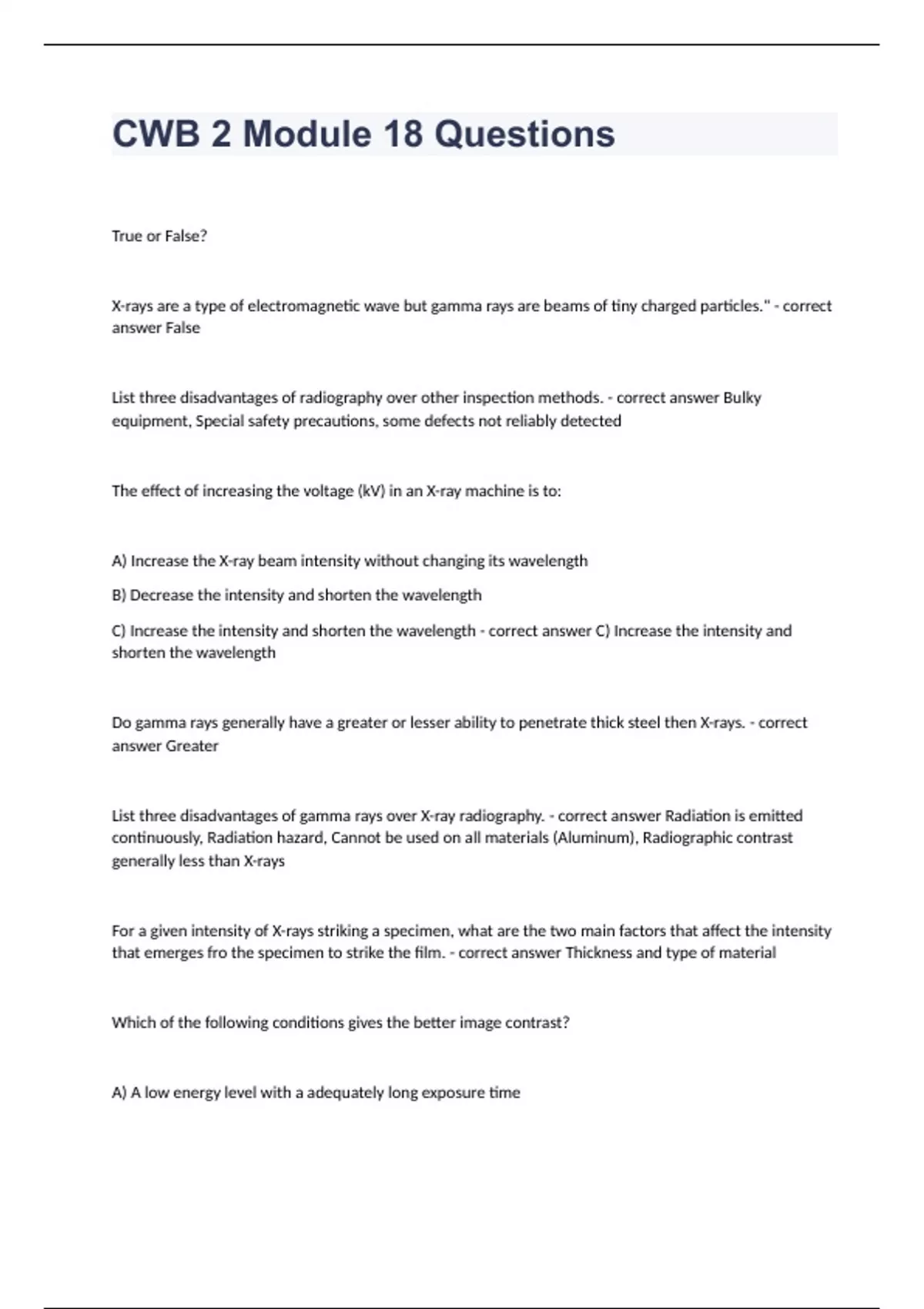 CWB 2 Module 18 Questions True or False? X-rays are a type of electromagnetic wave but gamma rays are beams of tiny charged particles." - correct answer False List three disadvantages of radiography over other inspection methods. - correct answer Bulky equipment, Special safety precautions, some defects not reliably detected The effect of increasing the voltage (kV) in an X-ray machine is to: A) Increase the X-ray beam intensity without changing its wavelength B) Decrease the intensity and shorten the wavelength C) Increase the intensity and shorten the wavelength - correct answer C) Increase the intensity and shorten the wavelength Do gamma rays generally have a greater or lesser ability to penetrate thick steel then X-rays. - correct answer Greater List three disadvantages of gamma rays over X-ray radiography. - correct answer Radiation is emitted continuously, Radiation hazard, Cannot be used on all materials (Aluminum), Radiographic contrast generally less than X-rays For a given intensity of X-rays striking a specimen, what are the two main factors that affect the intensity that emerges fro the specimen to strike the film. - correct answer Thickness and type of material Which of the following conditions gives the better image contrast? A) A low energy level with a adequately long exposure time B) A high energy level with a shorter exposure time - correct answer A) A low energy level with a adequately long exposure time Place the following in order of increasing absorption of X-rays: A) Steel B) Tungsten C) Welding Slag - correct answer Welding Slag, Steel, Tungsten True or False? The only thing that causes fuzziness at the edge of an image is geometric unsharpness - correct answer False, fuzziness is also caused by inherent unsharpness and scattering List the three dimensions that affect geometric unsharpness and the relationship among them (equation) - correct answer Source size, F; object-to-source distance, d; thickness, t Ug = Ft/d What is the simplest way to reducing the geometric unsharpness for a given plate and x-ray machine? - correct answer Increase the object (plate) to source distance True or False? The purpose of the IQI is to verify that all defects greater than 2% of the plate thickness have been detected. - correct answer False What features of the IQI image must be clearly distinguished on the radiograph when using X-ray. - correct answer Outline of the IQI and the 2T hole If it is not possible to place the IQI on the source side of the specimen, what can be done? A) Place the IQI on the film side but reduce the IQI by one size B) Place the IQI on the film side and use the same IQI size as you would on the source side C) Nothing, you cannot take a radiograph unless the IQI is on the source side - correct answer A) Place the IQI on the film side but reduce the IQI by one size Some dark crack-like indications appear on a radiograph. If they are not due to cracks in the actual specimen what else could the result from? - correct answer Scratches or cracks in the lead intensifying screens What is the specified range of density of a radiograph according to most codes? - correct answer 1.5 to 3.5 True or False? Since radiography is a volumetric method the condition of the surface is not an important factor - correct answer False How would you distinguish spatter from porosity of a radiography. - correct answer Spatter appears white or light and may cover the base metal as well as the weld. Porosity is normally confined to the weld metal and appears dark. True or False? Radiography is not recommended by CSA W59 for fillet welds. - correct answer True Which of the following defects could most likely be missed by radiography? A) A crack B) Porosity C) Slag inclusions - correct answer A) A crack