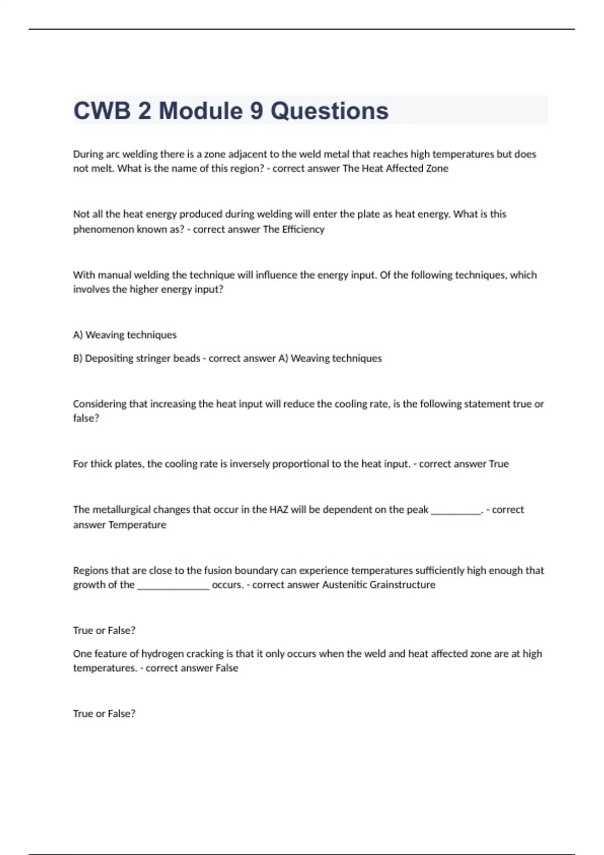 CWB 2 Module 9 QuestionsDuring arc welding there is a zone adjacent to the weld metal that reaches high temperatures but does not melt. What is the name of this region? - correct answer The Heat Affected Zone Not all the heat energy produced during welding will enter the plate as heat energy. What is this phenomenon known as? - correct answer The Efficiency With manual welding the technique will influence the energy input. Of the following techniques, which involves the higher energy input? A) Weaving techniques B) Depositing stringer beads - correct answer A) Weaving techniques Considering that increasing the heat input will reduce the cooling rate, is the following statement true or false? For thick plates, the cooling rate is inversely proportional to the heat input. - correct answer True The metallurgical changes that occur in the HAZ will be dependent on the peak _________. - correct answer Temperature Regions that are close to the fusion boundary can experience temperatures sufficiently high enough that growth of the _____________ occurs. - correct answer Austenitic Grainstructure True or False? One feature of hydrogen cracking is that it only occurs when the weld and heat affected zone are at high temperatures. - correct answer False True or False? Welding over a gap in the backing bar of a complete penetration weld may result in a transverse crack in the weld metal. - correct answer True In the heat affected zone of a weld in carbon steel, fast cooling rates will form a hard _________________. - correct answer Martensitic Microstructure Which of the following types of steel is the least susceptible to hydrogen cracking in normal circumstances? A) High strength, high hardness steels B) Low strength, low hardness steels C) All steels have the same susceptibility to hydrogen cracking - correct answer B) Low strength, low hardness steels True or False? The carbon equivalent formula available in CSA W59 is one of several possible formulas available. - correct answer True Which crack susceptibility test uses plates of different thicknesses to change the cooling rate? - correct answer Controlled Thermal Severity (CTS) True or False? Solidified weld metal will have a microstructure the same as that of the parent material (plate) - correct answer False The proportion of parent metal melted into the weld is known as the _____________. - correct answer Dilution