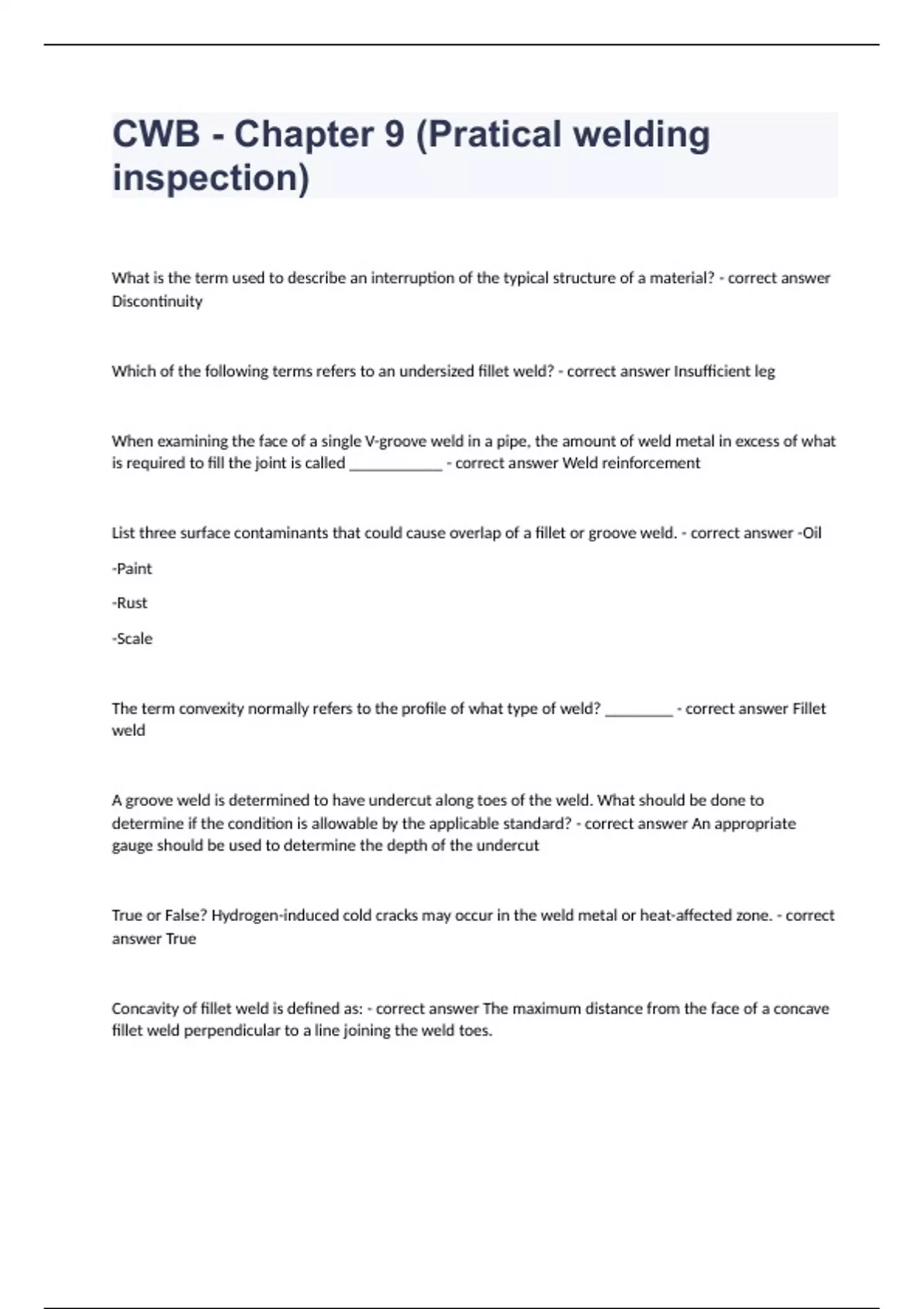 CWB - Chapter 9 (Pratical welding inspection)What is the term used to describe an interruption of the typical structure of a material? - correct answer Discontinuity Which of the following terms refers to an undersized fillet weld? - correct answer Insufficient leg When examining the face of a single V-groove weld in a pipe, the amount of weld metal in excess of what is required to fill the joint is called ___________ - correct answer Weld reinforcement List three surface contaminants that could cause overlap of a fillet or groove weld. - correct answer -Oil -Paint -Rust -Scale The term convexity normally refers to the profile of what type of weld? ________ - correct answer Fillet weld A groove weld is determined to have undercut along toes of the weld. What should be done to determine if the condition is allowable by the applicable standard? - correct answer An appropriate gauge should be used to determine the depth of the undercut True or False? Hydrogen-induced cold cracks may occur in the weld metal or heat-affected zone. - correct answer True Concavity of fillet weld is defined as: - correct answer The maximum distance from the face of a concave fillet weld perpendicular to a line joining the weld toes. When making a fillet weld in a lap joint, melting of the base plate upper edge may be caused by: - correct answer Operator technique True or False? Careless back gouging of a single V-groove weld can lead to out-of-line weld beads. - correct answer True Which of the following is a fusion discontinuity in a complete joint penetration groove weld? - correct answer -Incomplete sidewall fusion -Underbead non-fusion Which term below describes a condition at the root of a groove weld where the weld metal does not extend through the joint thickness? - correct answer Incomplete joint penetration. Which of the following is considered a process or procedure related weld discontinuity? Select all that apply: - correct answer -Lamellar tearing -Distortion -Cracking -Porosity What type of porosity usually occurs with an orientation perpendicular to the weld face? - correct answer Piping List three probable basic causes of porosity: - correct answer -moisture -surface impurities -chemistry imbalance -technique -air flow -flux -slag