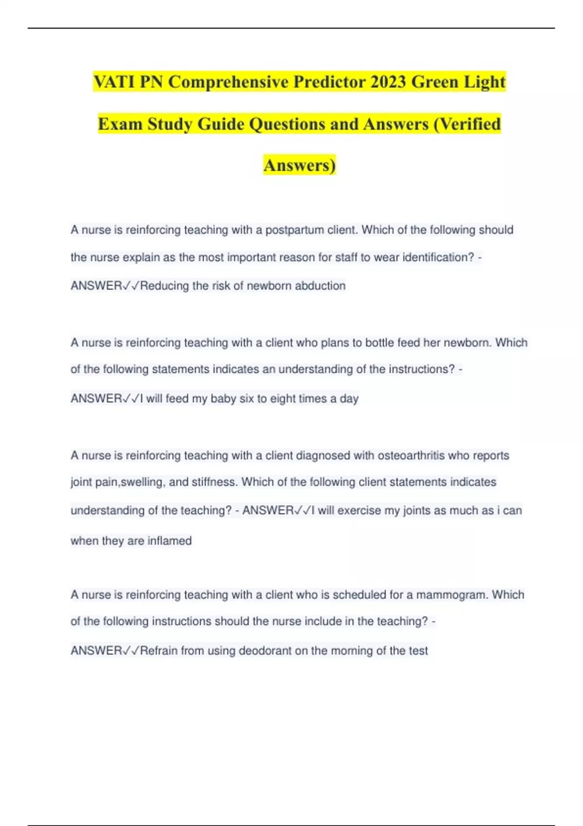 VATI PN Comprehensive Predictor 2023 Green Light Exam Study Guide Questions and Answers (Verified Answers) A nurse is reinforcing teaching with a postpartum client. Which of the following should the nurse explain as the most important reason for staff to wear identification? - ANSWERReducing the risk of newborn abduction A nurse is reinforcing teaching with a client who plans to bottle feed her newborn. Which of the following statements indicates an understanding of the instructions? - ANSWERI will feed my baby six to eight times a day A nurse is reinforcing teaching with a client diagnosed with osteoarthritis who reports joint pain,swelling, and stiffness. Which of the following client statements indicates understanding of the teaching? - ANSWERI will exercise my joints as much as i can when they are inflamed A nurse is reinforcing teaching with a client who is scheduled for a mammogram. Which of the following instructions should the nurse include in the teaching? - ANSWERRefrain from using deodorant on the morning of the test A nurse is preparing a clients insulin regimen. Which of the following insulin's can be mixed? - ANSWERInsulin aspart, regular insulin, insulin lispro A nurse is reinforcing discharge teaching with a client who is postoperative following laser surgery for open-angle glaucoma. Which of the following statements by the client indicates an understanding of the instructions? - ANSWERI will take a stool softener to prevent constipation A nurse is caring for a client who had a stroke and is having difficulty swallowing. The nurse should recommend a referral to which of the following members of the interprofessional team? - ANSWERSpeech therapist A nurse is reinforcing teaching with a client who is 12 hr postpartum and has an episiotomy. Which of the following instructions should the nurse include? - ANSWERChange the perineal pad with each void A nurse is collecting data from a child who has acute Glomerulonephritis. Which of the following findings should the nurse expect? - ANSWERPeriorbital edema A nurse is preparing to administer a liquid medication to