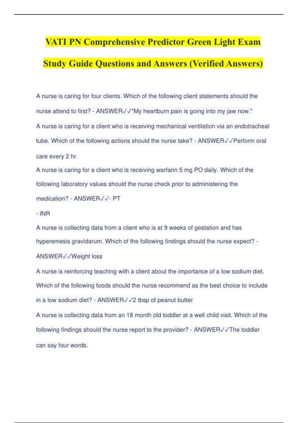 VATI PN Comprehensive Predictor Green Light Exam Study Guide Questions and Answers (Verified Answers) A nurse is caring for four clients. Which of the following client statements should the nurse attend to first? - ANSWER"My heartburn pain is going into my jaw now." A nurse is caring for a client who is receiving mechanical ventilation via an endotracheal tube. Which of the following actions should the nurse take? - ANSWERPerform oral care every 2 hr. A nurse is caring for a client who is receiving warfarin 5 mg PO daily. Which of the following laboratory values should the nurse check prior to administering the medication? - ANSWER- PT - INR A nurse is collecting data from a client who is at 9 weeks of gestation and has hyperemesis gravidarum. Which of the following findings should the nurse expect? - ANSWERWeight loss A nurse is reinforcing teaching with a client about the importance of a low sodium diet. Which of the following foods should the nurse recommend as the best choice to include in a low sodium diet? - ANSWER2 tbsp of peanut butter A nurse is collecting data from an 18 month old toddler at a well child visit. Which of the following findings should the nurse report to the provider? - ANSWERThe toddler can say four words. A nurse is collecting data from a client who has diabetes mellitus. Which of the following findings indicates that the client might be experiencing diabetic ketoacidosis? - ANSWERKussmaul respirations A nurse is reinforcing teaching with a clien