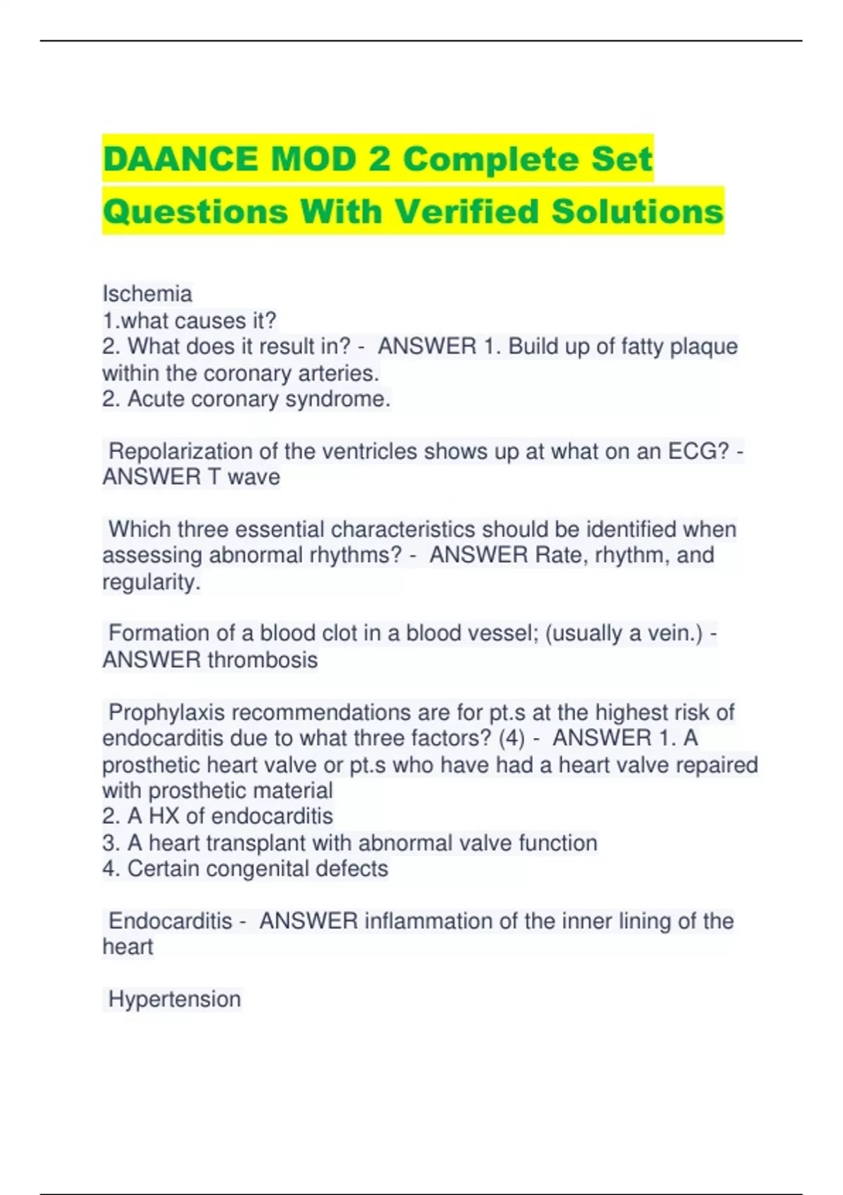 DAANCE MOD 2 Complete Set Questions With Verified Solutions Ischemia causes it? 2. What does it result in? - ANSWER 1. Build up of fatty plaque within the coronary arteries. 2. Acute coronary syndrome. Repolarization of the ventricles shows up at what on an ECG? - ANSWER T wave Which three essential characteristics should be identified when assessing abnormal rhythms? - ANSWER Rate, rhythm, and regularity. Formation of a blood clot in a blood vessel; (usually a vein.) - ANSWER thrombosis Prophylaxis recommendations are for pt.s at the highest risk of endocarditis due to what three factors? (4) - ANSWER 1. A prosthetic heart valve or pt.s who have had a heart valve repaired with prosthetic material 2. A HX of endocarditis 3. A heart transplant with abnormal valve function 4. Certain congenital defects Endocarditis - ANSWER inflammation of the inner lining of the heart Hypertension What is it? Symptoms? - ANSWER abnormally high blood pressure (higher than 120/80). Frequent dizziness, nosebleeds, / headaches Major complications of hypertension - ANSWER Stroke, coronary artery disease, and renal failure congestive heart failure (CHF) 1. What is it? cteristics? - ANSWER 1.A clinical syndrome due to heart disease. Caused by the hearts inability to handle blood volume coming back from either the lungs or peripheral circulation. hlessness and abnormal water and sodium retention resulting in edema. Any variation from the normal rhythm of the heart beat - ANSWER Arrythmia disturbance of a cardiac rhythm - ANSWER Dysrhythmia Ventricular Rhythms - ANSWER Cardiac dysrhythmia in which the pacemaker is in the ventricles rather than in the SA node or atria. More likely to lead to arrest rhythms. PR interval 1. How long is it on an EKG strip? 2. What heart function does it represent? 3. What does it measure? - ANSWER 1. Less than one block (200 milliseconds or 0.2 seconds.) 2. The delay between the SA and AV node 3. AV conduction time. Normal is 0.12-0.2 seconds (3-5 small boxes.) paroxysmal - ANSWER beginning suddenly or abruptly P wave - ANSWER depolarization (contraction) of the atria QRS complex 1. What does is represent? 2. How big is it on an EKG strip? - ANSWER 1. depolarization (contraction) of the ventricles. 2. Width of less than 1/2 of one large block. (Approximately 100 milliseconds or 0.1 second.) What does smoking predispose Pt.s to? - ANSWER Laryngospasms and bronchospasms Heart and lung disease Mallampati classification - ANSWER A visual analysis of the oral/pharyngeal anatomy Class 1. Visualization of the soft palate, fauces, uvula, anterior and posterior pillars Class 2. Visualization of the soft palate, fauces, and uvula Class 3. Visualization of the soft palate, and base of uvula. Class4. Soft palate not visible at all. Upper respiratory infection (URI) - ANSWER infectious diseas